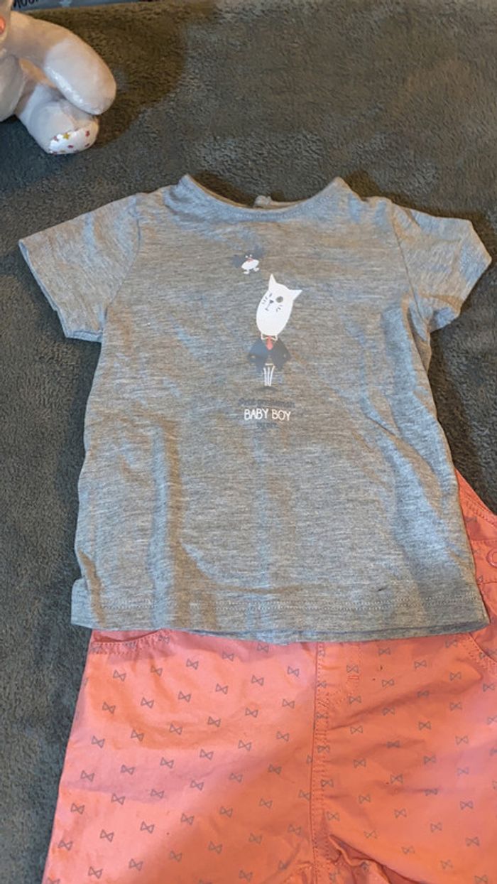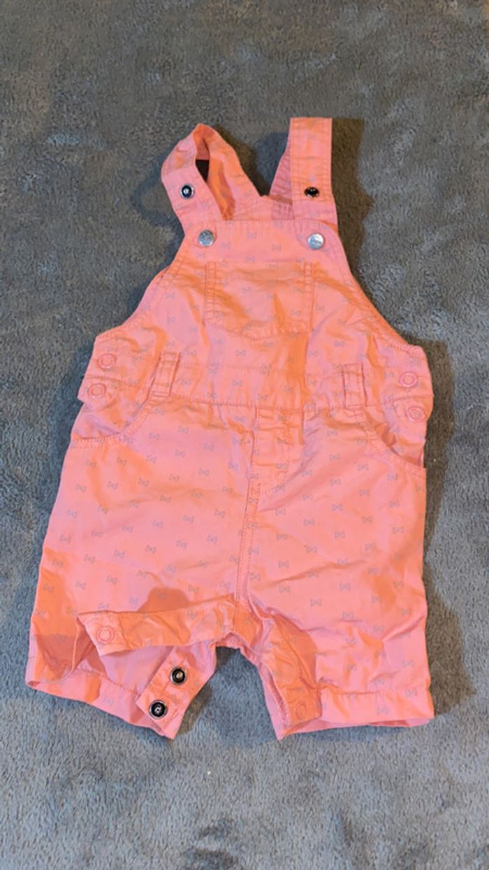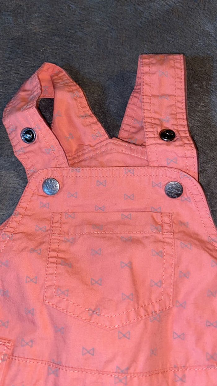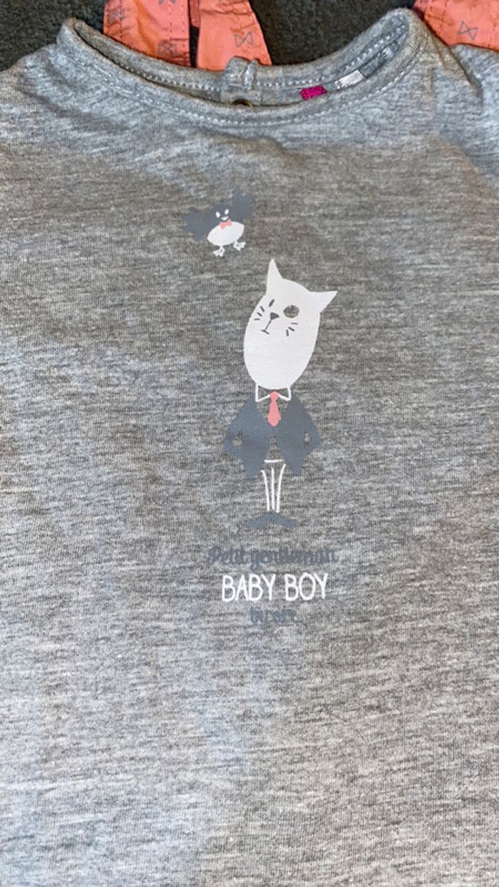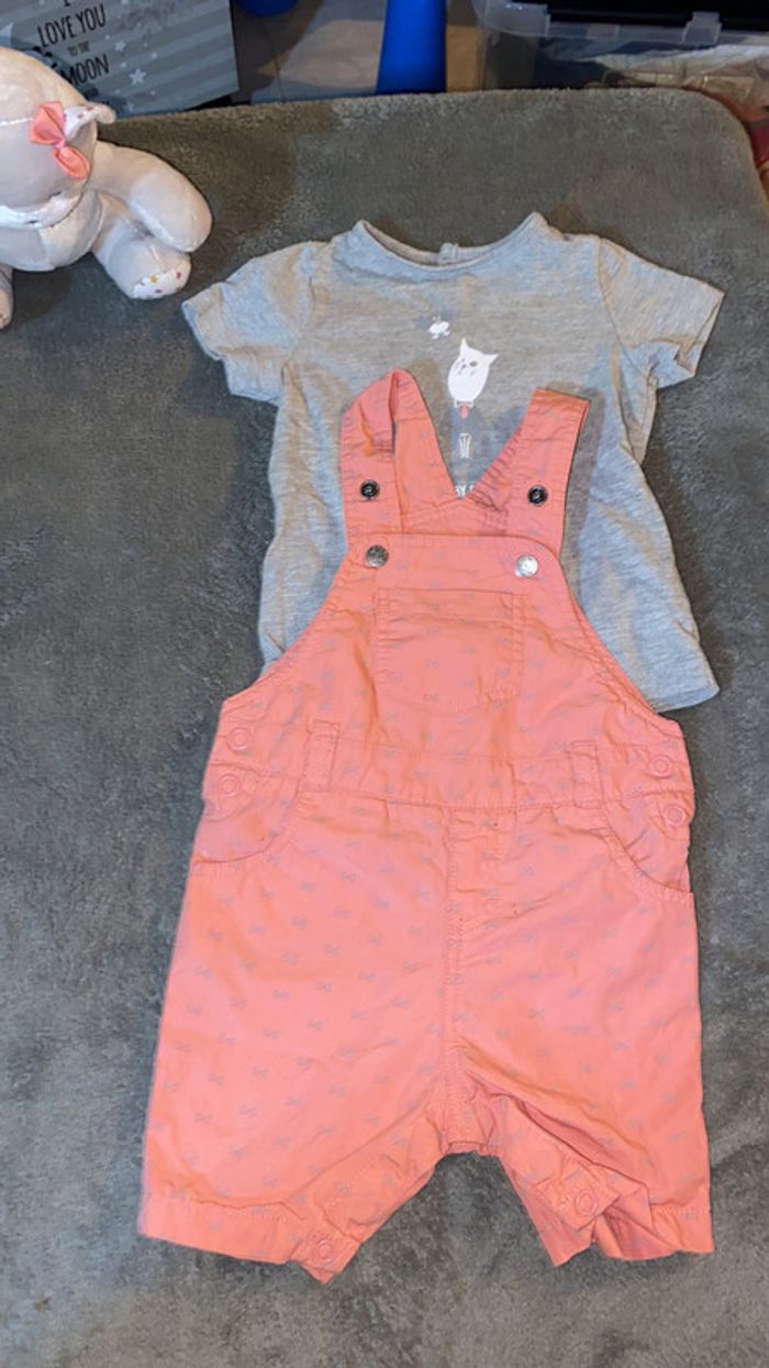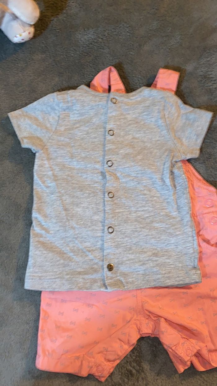 salopette avec motifs noeuds papillon tee shirt gris assorti ouverture par pressions entrejambe bretelles réglables parfait état taille 6 mois #charliesdressing6mois