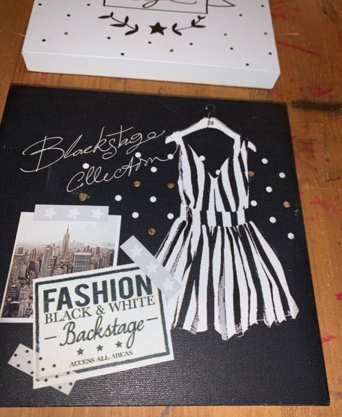 Lot deux tableaux décoration Maison du Monde Thème mode Texte « Fashion is my Life » Dessin robe trapèze backstage collection Structure bois Visuel sur toile Tableau Blanc noir