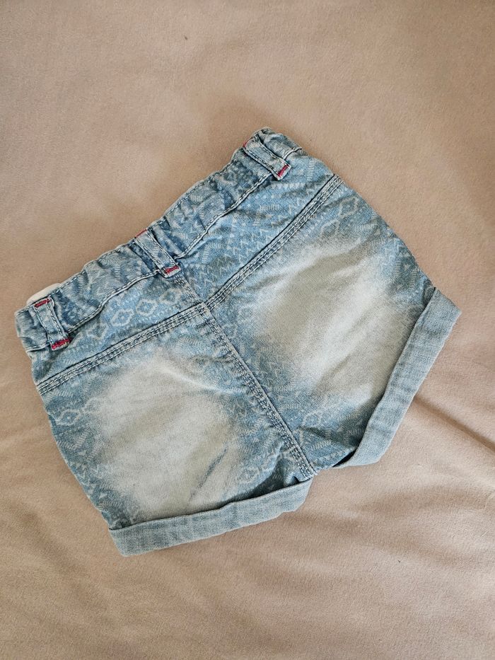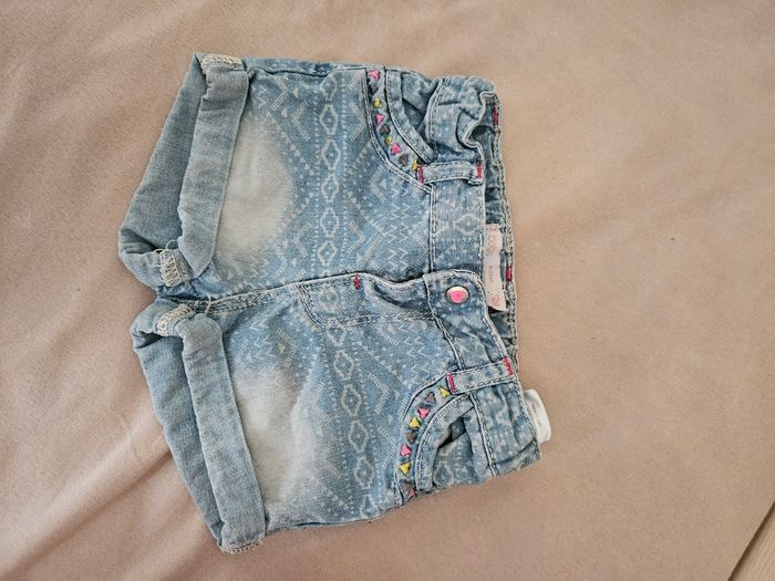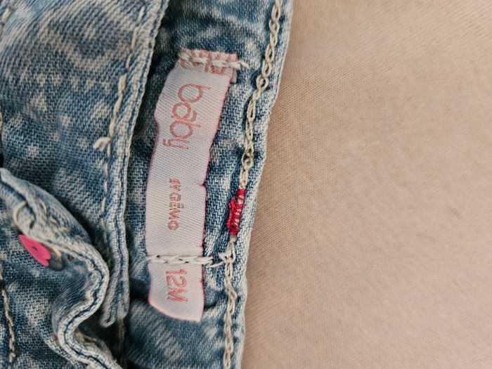 Short en jean bébé fille ; une marque aux fesses (voir photo 2) mais sinon il est en très bon état...Ma fille l'a porté comme ça, c'est un vêtement qui a déteind dessus mais ça ne se voit pas une fois porté Taille 12 mois