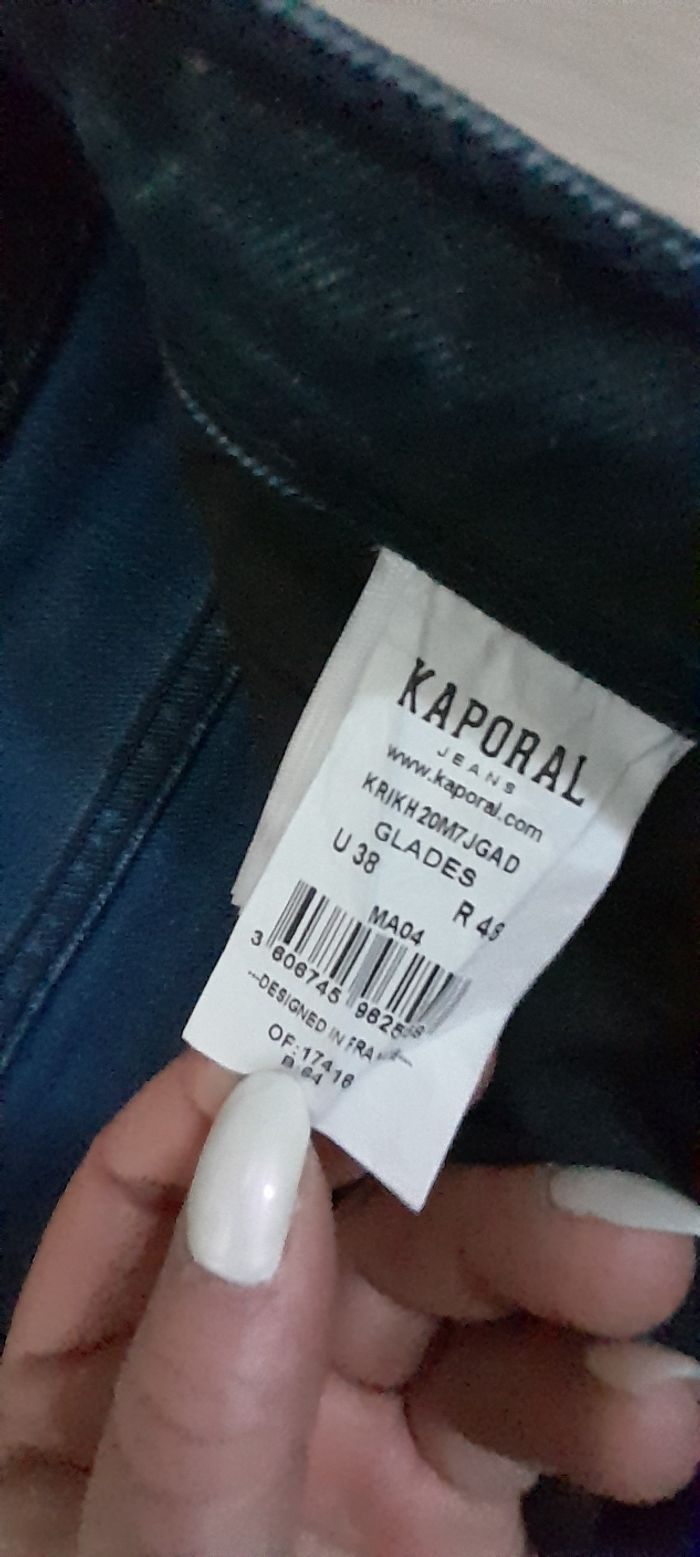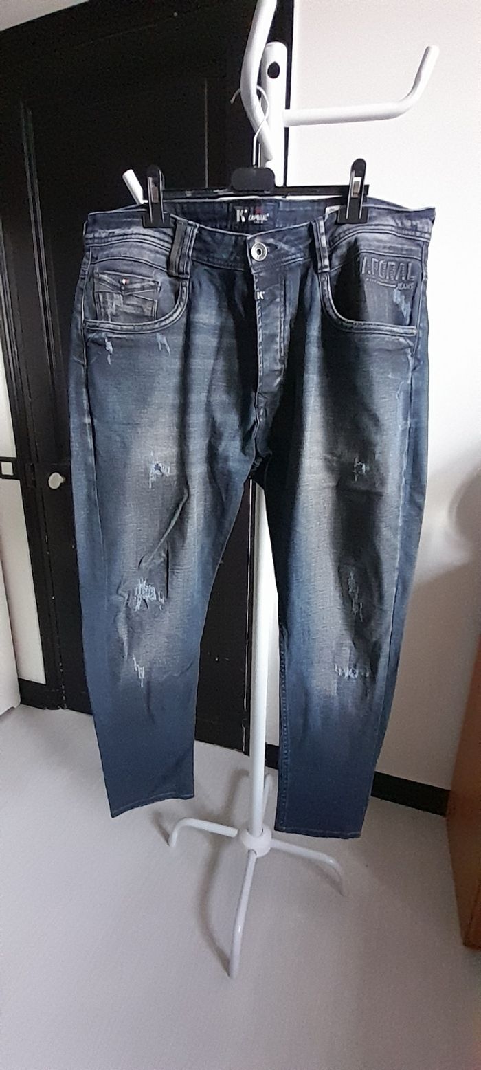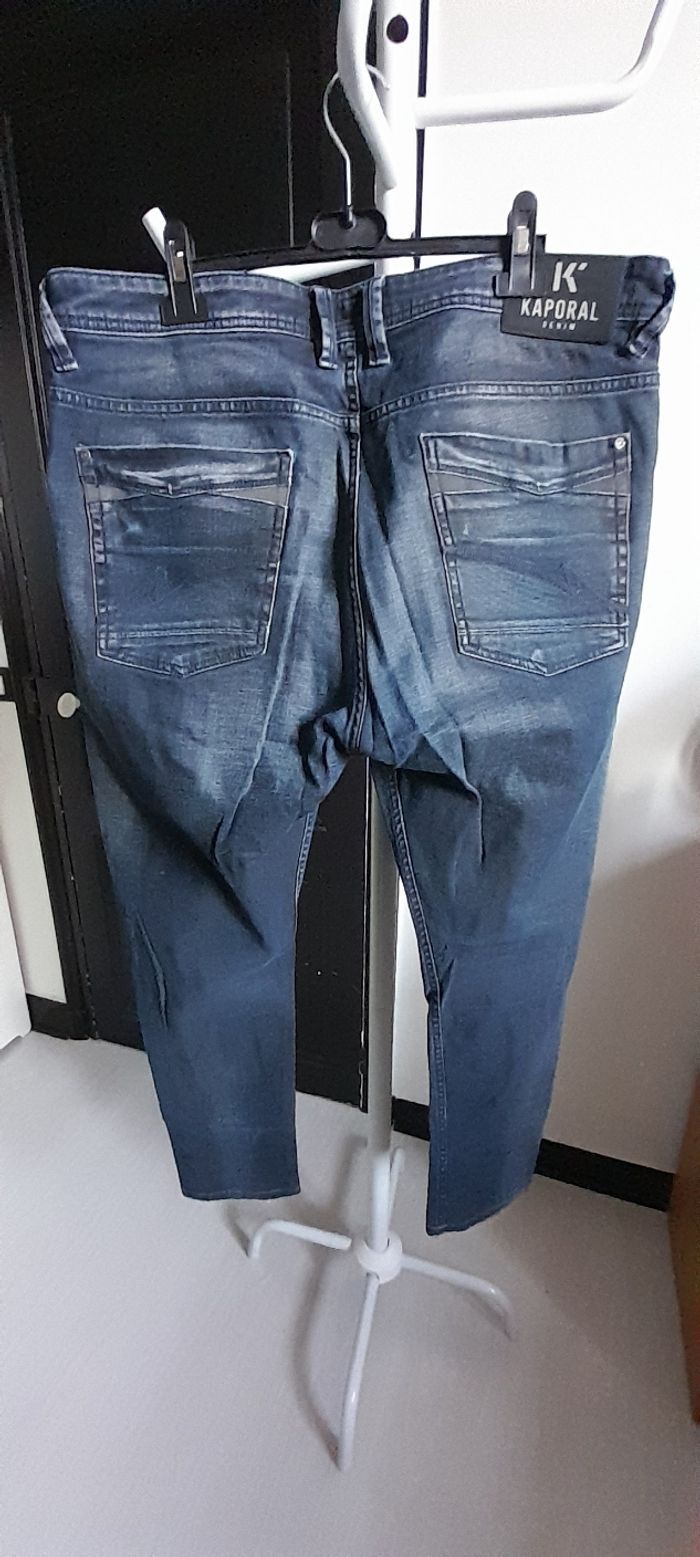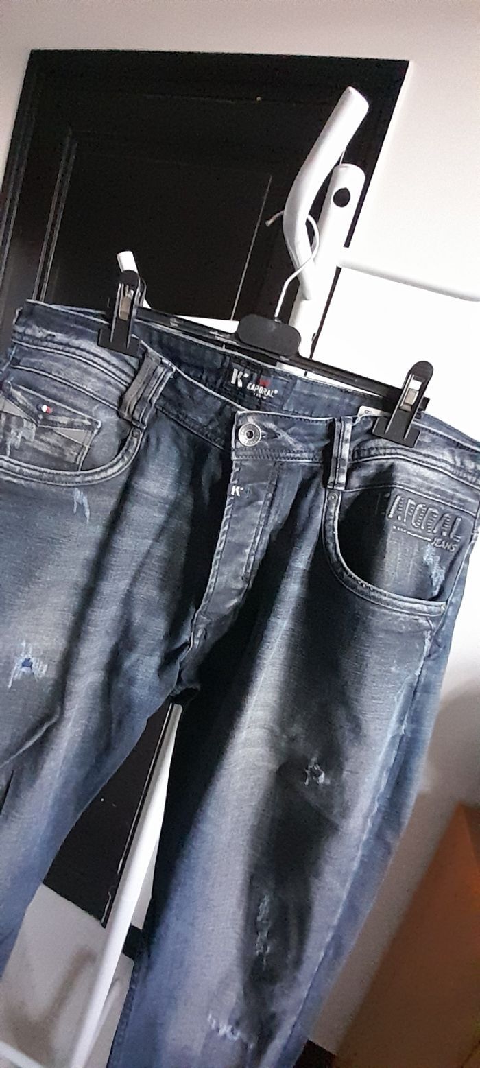 Jeans taille U 38 = 46/48 Marque KAPORAL Couleur bleu marine Attache boutons Passants pour ceinture 3 poches devant/ 2 poches arrière 98 % coton et 2 % Elasthane Quasi neuf porté maxi 1 fois
