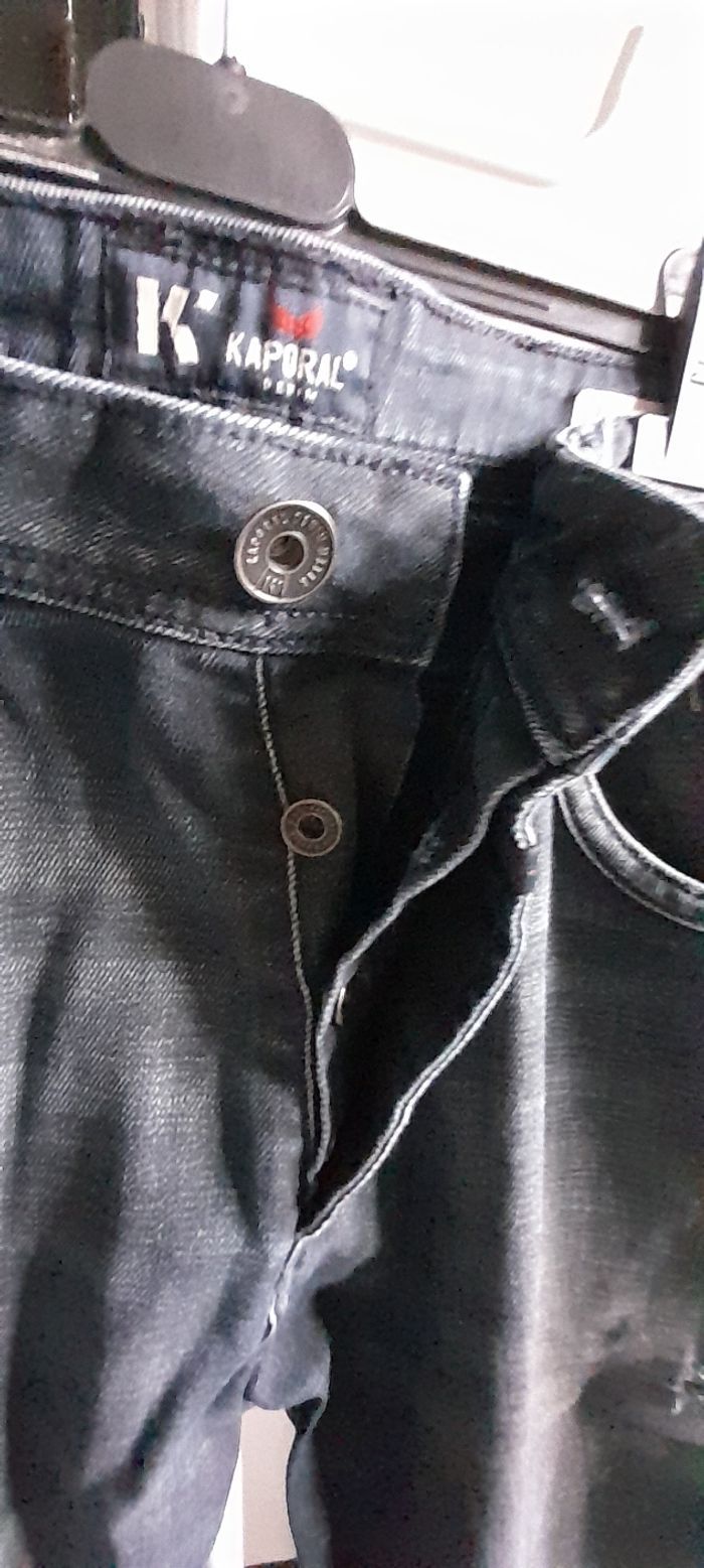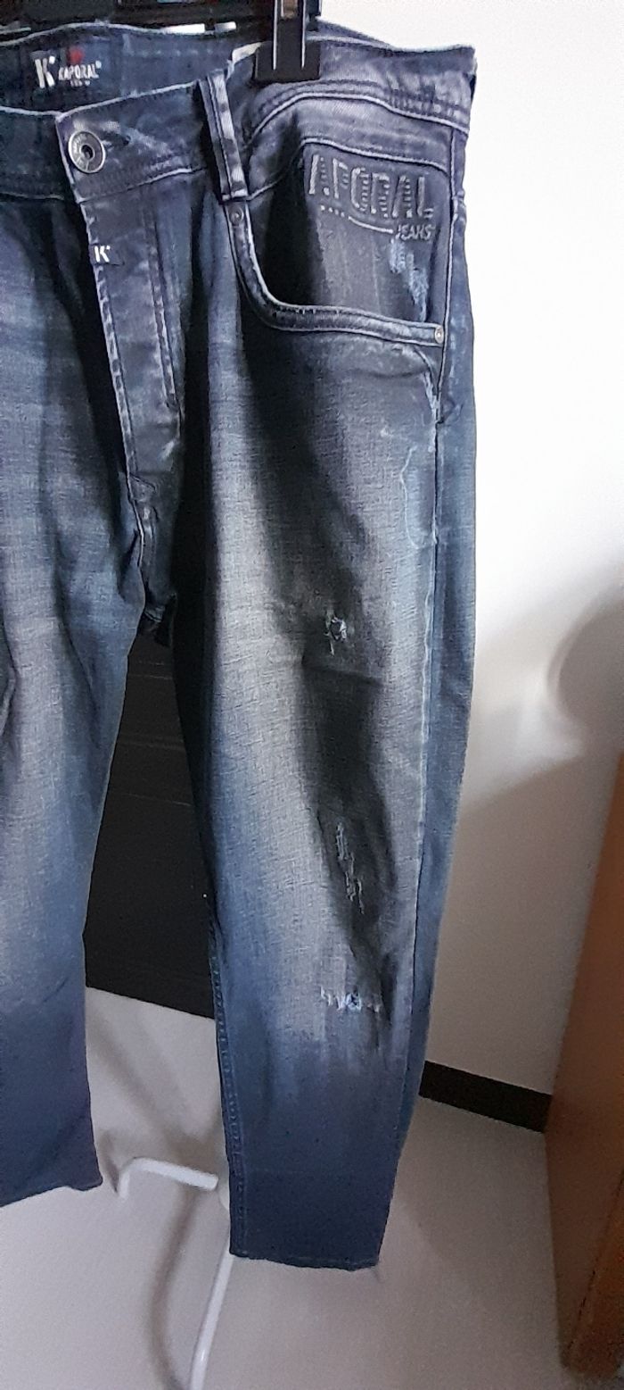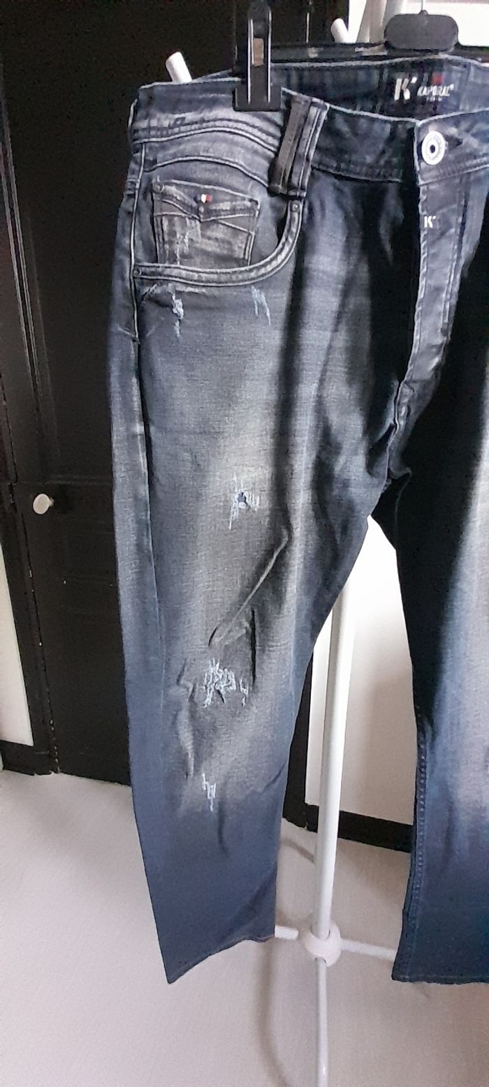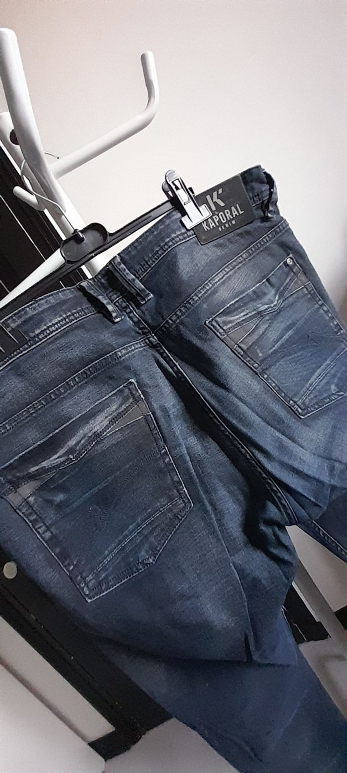 Jeans taille U 38 = 46/48 Marque KAPORAL Couleur bleu marine Attache boutons Passants pour ceinture 3 poches devant/ 2 poches arrière 98 % coton et 2 % Elasthane Quasi neuf porté maxi 1 fois