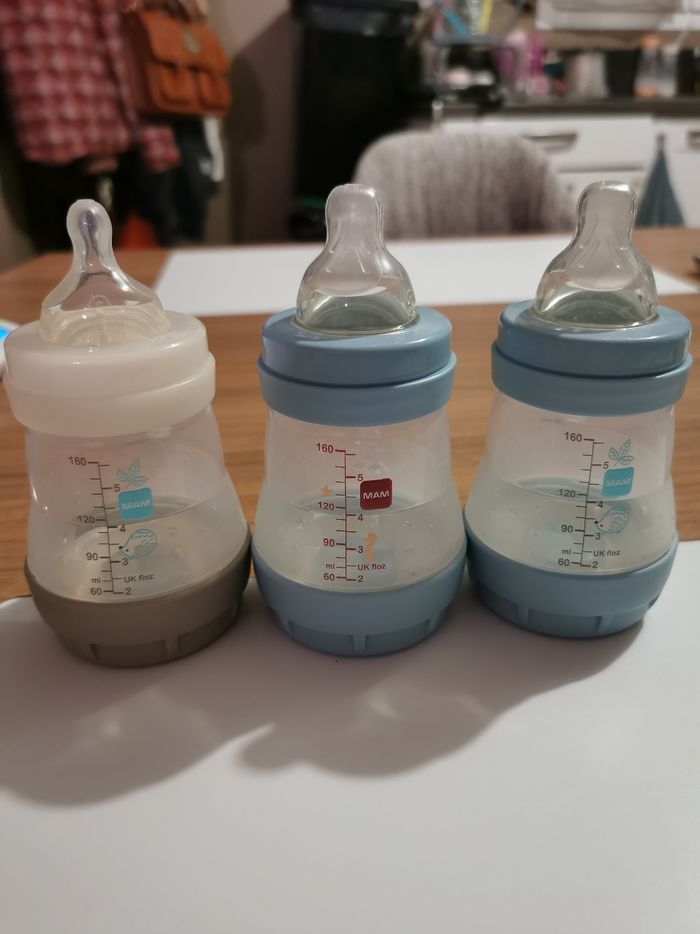 Vends 3 biberons de la marque Mam : -3 biberons quantité 160ml -4 tétines débit 1 qui sont sur la dernière photo -4 tétines débit 2 dont 3 sur les biberons et une sans biberon Utilisés quelques mois, mais en très bon état, tout sera nettoyé et stérilisé, mais à re nettoyer bien sûr.