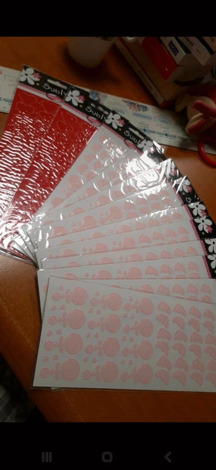 planche = 1euro Lot gros possible #zaceci28puericulture #zaceci28jouet Pied hochet fille rose cœur rouge planches d'autocollants rose couleur pied hochet petits cœurs planche de la collection Subly de la marque Maildor Un autocollant mesure de 0.7 cm à 3.5 cm. de haut environ Raffinés, les Peel Off Maildor permettent de finaliser avec délicatesse vos créations Très simples d'utilisation, pour enfants et adultes, les Peel Off s'appliquent sur tous supports: papier, carton, verre, plastique, ... La planche mesure 10 cm x 22.5 cm environ Ideal carterie scrapbooking decoration invitation mariage anniversaire baptêmes babyshower