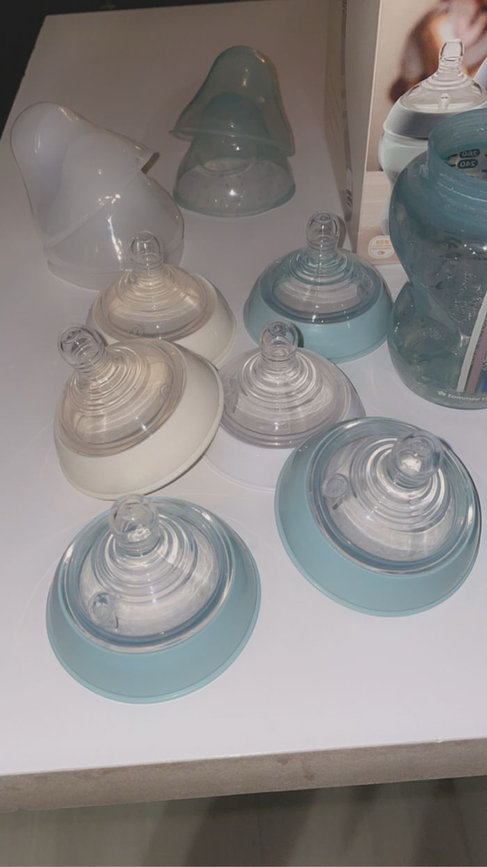 Utilisé 3 mois Tétines NEUVES ! 3 biberons 150ml 3 biberons 260ml 2 sucettes neuves 6 capuchons Modèle Closer to nature avec valve anti colique Tétine forme sein (Facile à prendre en bouche, sensation proche de la peau. Elle imite et reproduit la flexion et les mouvements naturels du sein pour une tétée tout en confort)
