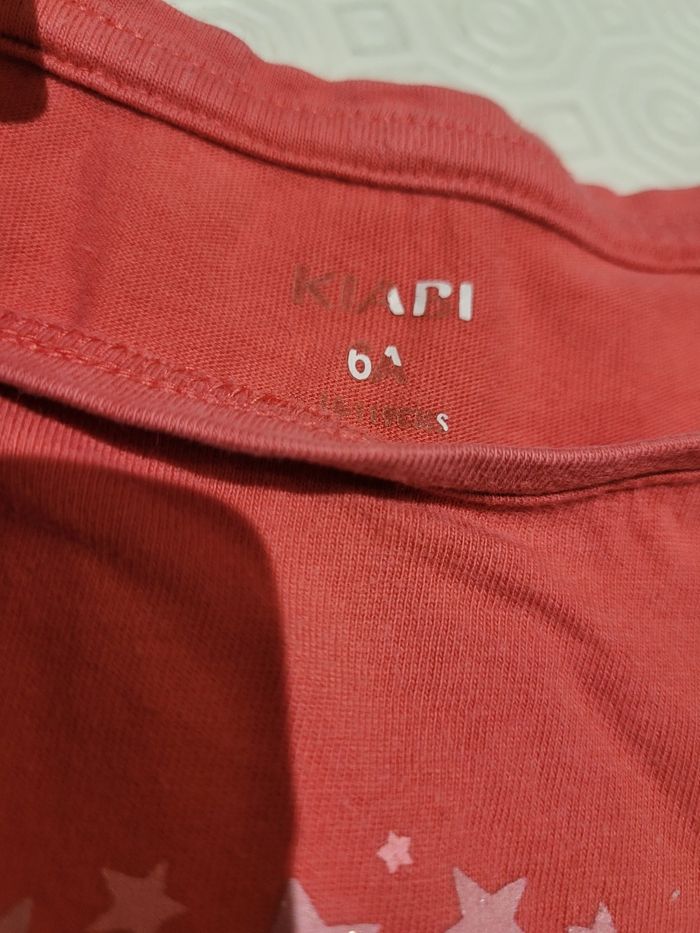 T-shirt manches courtes rose orangé avec imprimés étoiles en forme de tête. Marque : Kiabi Taille: 6 ans