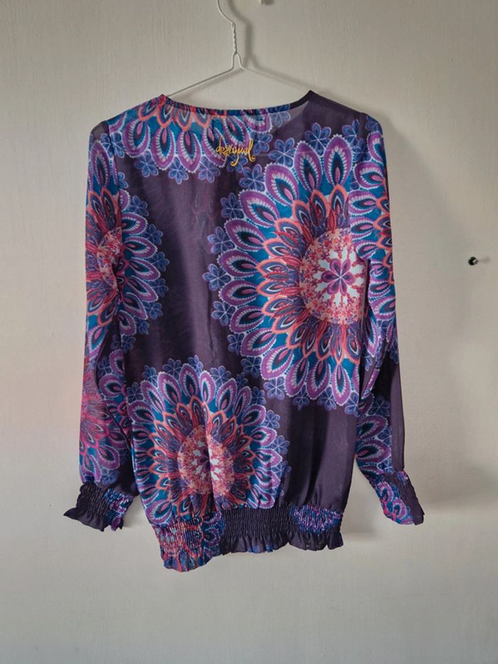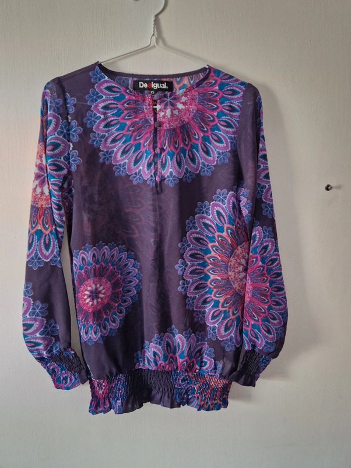 ✅️ Parfait état Haut manches longues, transparent. A porter avec ou sans haut en dessous 😊 4 boutons que l'on peut ou pas fermer au niveau du col #tshirt #hautfemme #hautmancheslongues #transparent #desigualxs #desigual #fleur #vintage