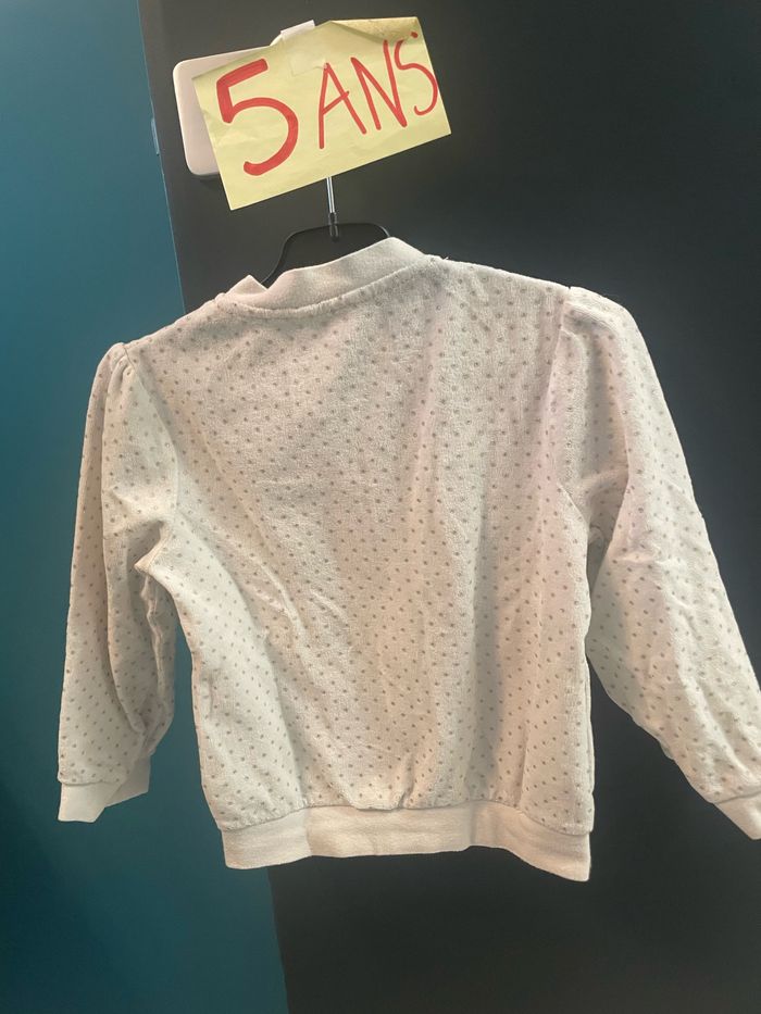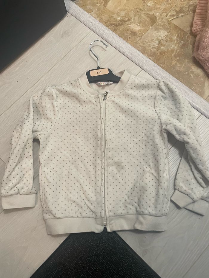 Gilet blanc à paillettes argentées 5 ans Légère tache sombre mais ne se voit pas une fois porté voir dernière photo N’hésitez pas à jeter un œil sur mes autres annonces