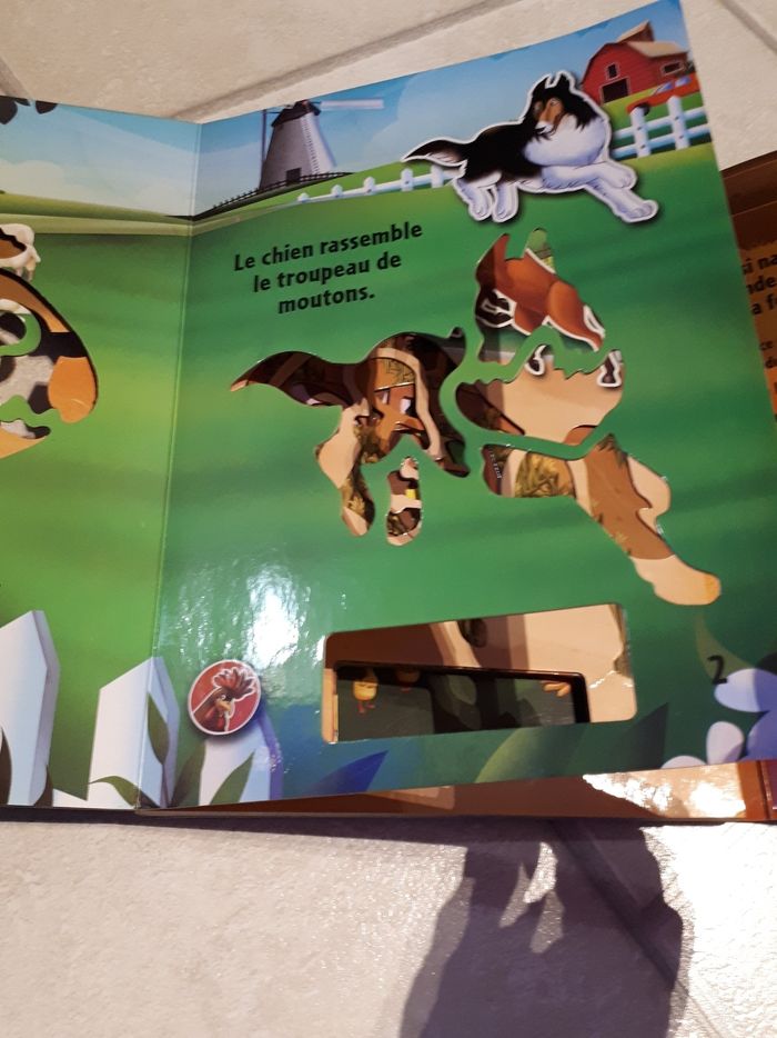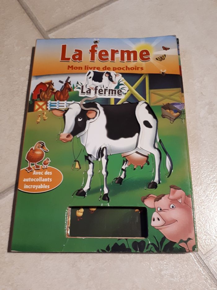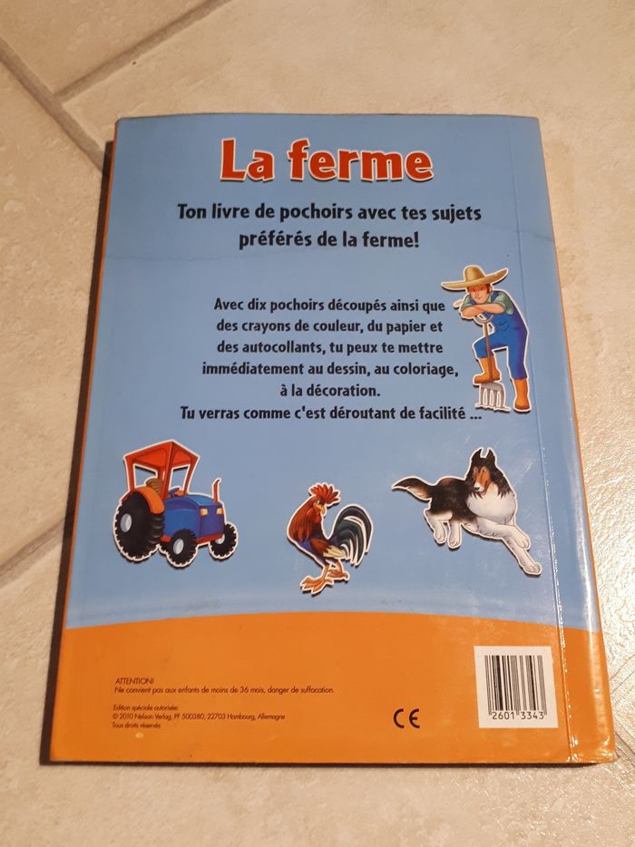 Livre avec pochoirs sur la ferme. Vendu sans ses crayons et sans ses autocollants