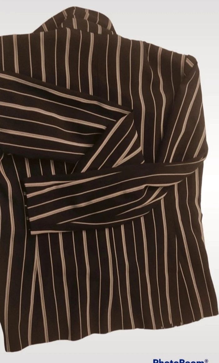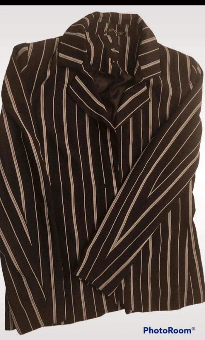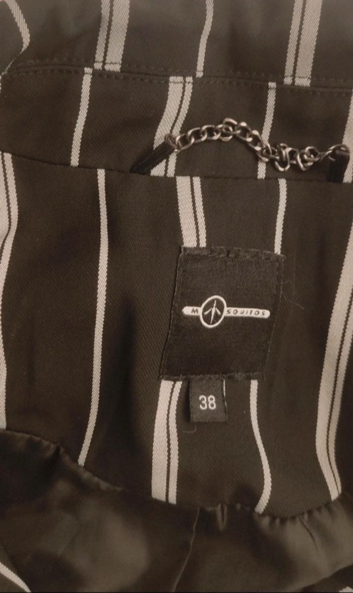 Petite veste rayée de couleur noire claire et blanche Petite chaînette dans la nuque Légèrement ceintrée Il manque le bouton mais les Couturières pourront le remettre aisément Peu portée Taille notée ; 38 Marque : Mosquitos Réductions activées sur les lots #T38_laurence8777