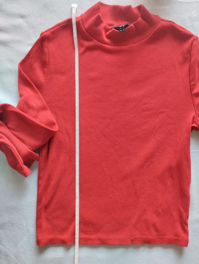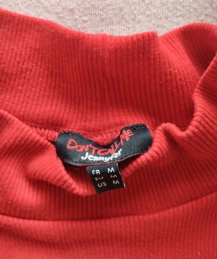 Pull côtelé rouge a col rond Il est elasthane Des fils commencent un peu à partir sur le bas Mensurations sur les dernières photos Taille notée : M Marque : Jennyfer Réduction sur les lots activée #T38_laurence8777
