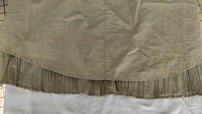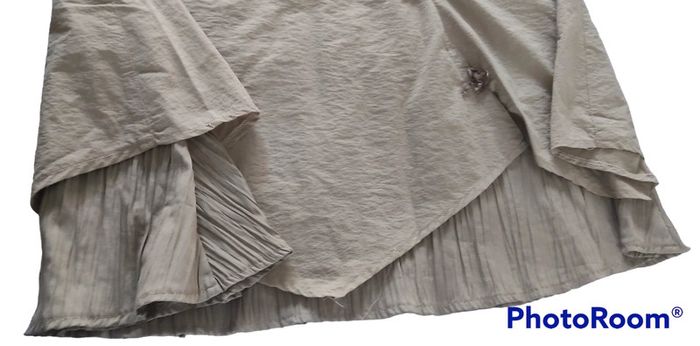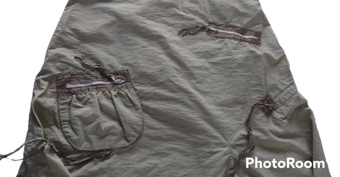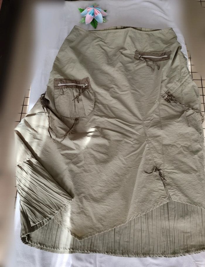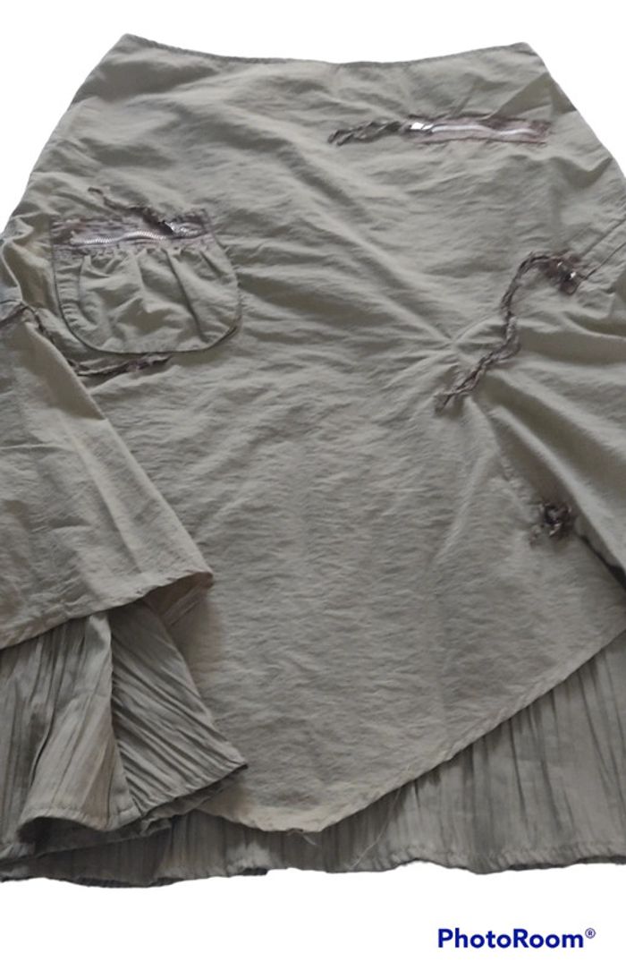Jupe sympathique mi longue kaki Plusieurs poches zippées mais toutes ne sont pas des vraies Les lacets ne sont plus top mais ils peuvent être enlevés. Ça ne gâchera pas la jupe La doublure de la jupe est plissée Le dessus en pointe Sa longueur est de 82 cm Taille notée : 46 Marque: Patrice Breal Prix négociable dans la limite du raisonnable Réduction sur les lots activée #T46_laurence8777
