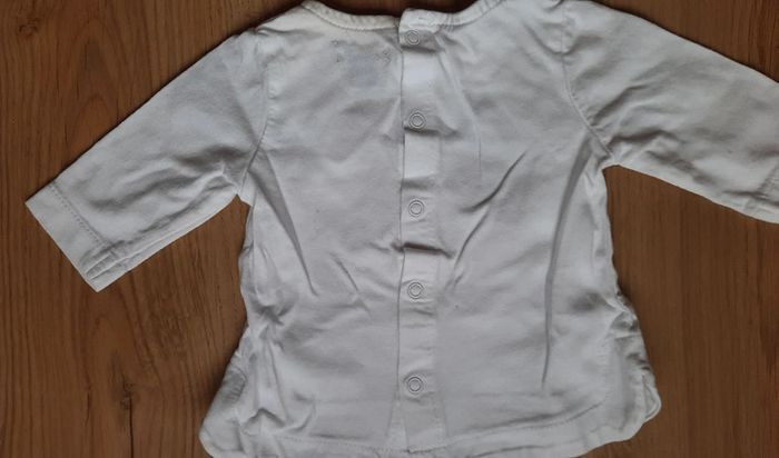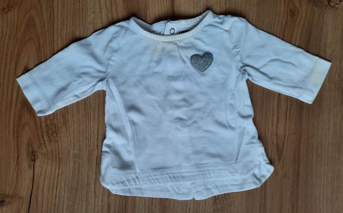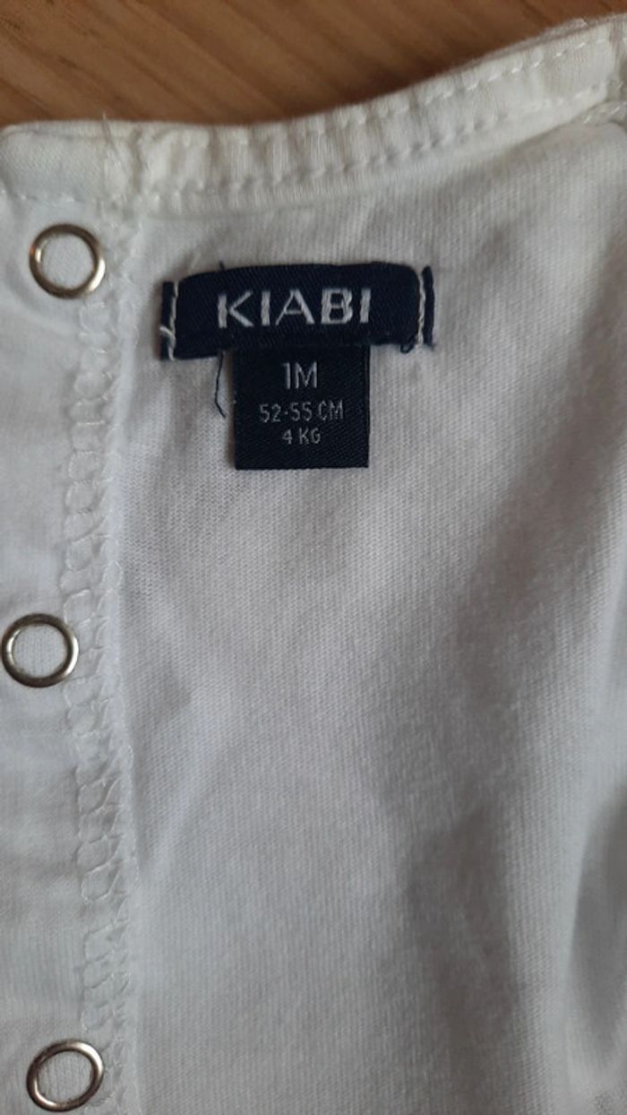 Combinaison Obaïbi 1 mois (53cm) s'attache par des boutons aux épaules et des pressions entre les jambes. Le tee-shirt n'était pas vendu avec mais j'avais l'habitude de le mettre avec cette combinaison. C'est un tee-shirt manches longues blanc avec un petit coeur gris Kiabi 1 mois (52-55cm), il s'attache dans le dos par des pressions et est légèrement jauni au niveau du col et sur une des manches, mais le tout est en très bon état.