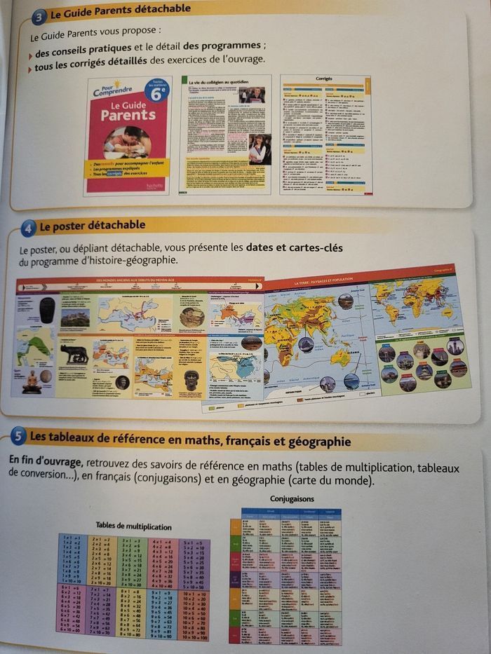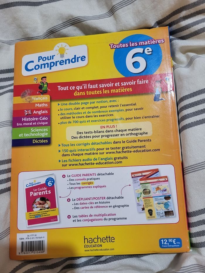 Pour comprendre toutes les matières 6ème Hachette Éducation + corrigés Il y a 1 page faite, peut-être 2... Couverture rayée et un peu abîmée mais intérieur comme neuf. Juste 1 page cornée, et la 1ère page un peu rayée où le guide a été enlevé. Manque le poster d'histoire géographie.