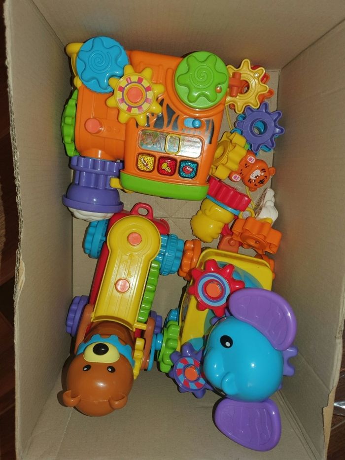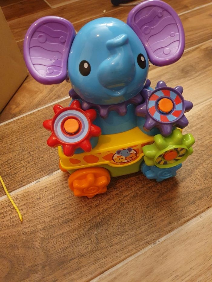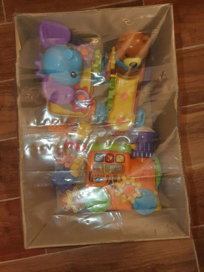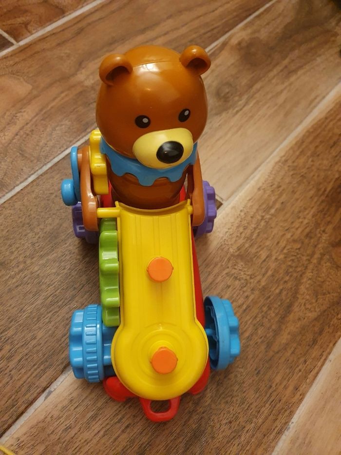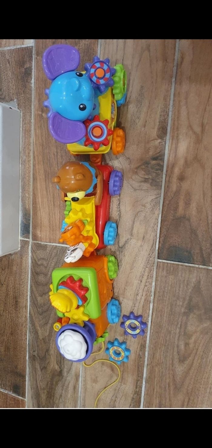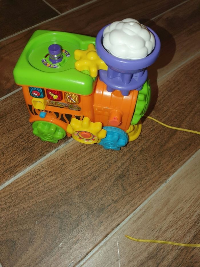 Train roulant [ avec ficelle) le train invite l'enfant à sélectionner un instrument [ bouton] ou à déplacer le curseur. Plusieurs modes. Plusieurs engrenages à échanger. En fonction de l'engrenage animal positionné sur la locomotive Très bon état.