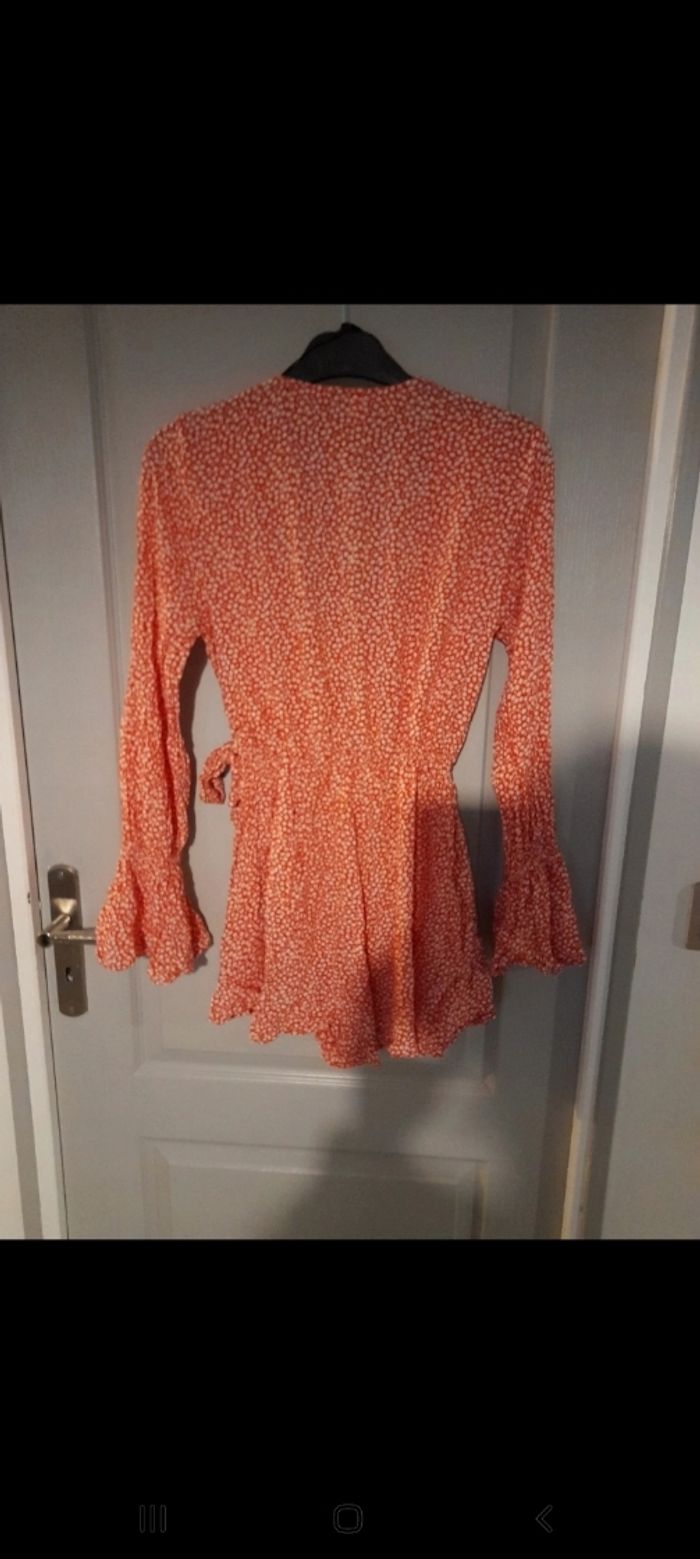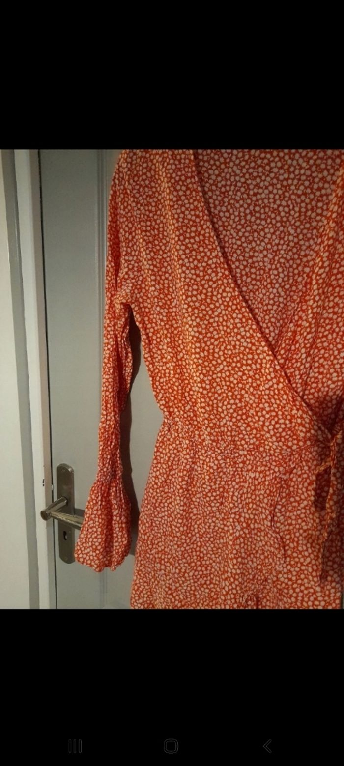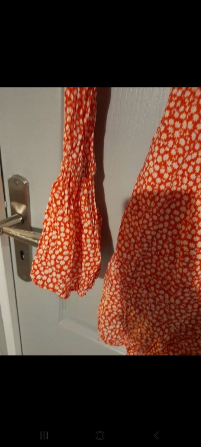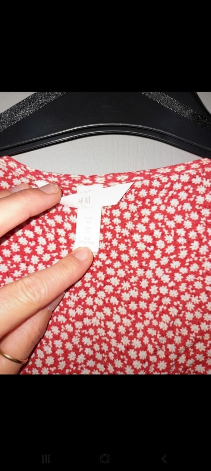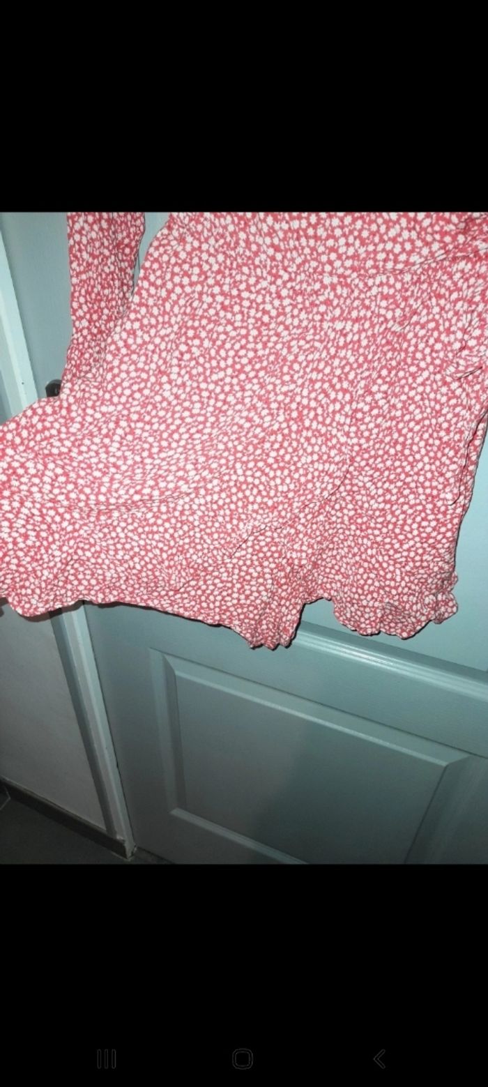 Combishort de marque H&M, couleur rouge et blanc, motif florale, taille 38. Très bon état avec manches longues. Ceinture élastique et lanières à nouer à la taille