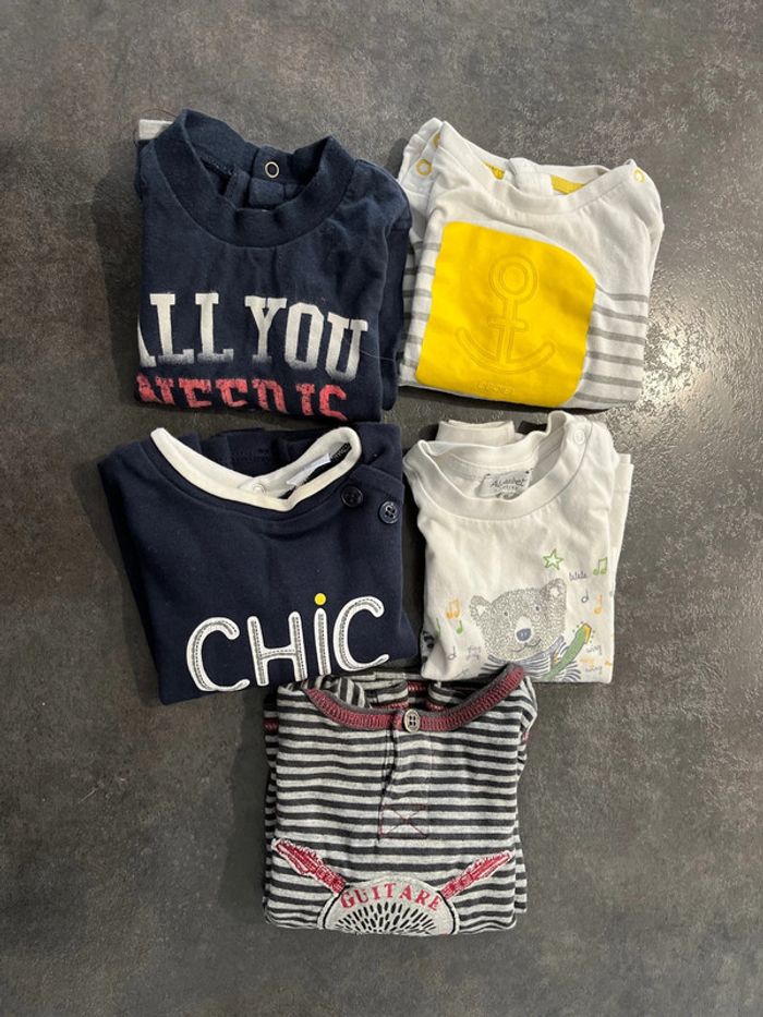 Lot de 5 t-shirts manche longues en 6 mois Très bon état. Plusieurs marques Gros lot 6 mois sur le dressing
