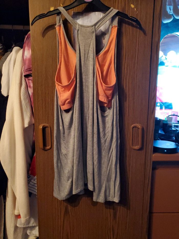 Débardeur gris avec brassière intégré. Il n'y a plus d'étiquette mais je dirais un M ou L.