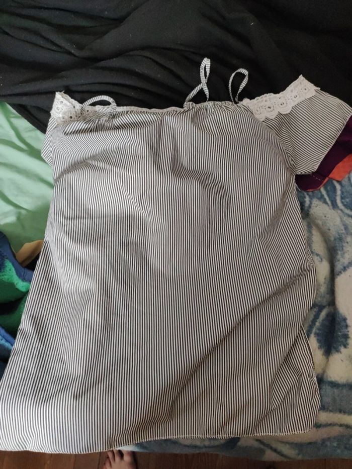 Haut rayé. Porté quelques fois en très bon état. Je dirai un 42 mais pas sur vu qu'il n'y a pas d'étiquette. Acheté sur ce même site.