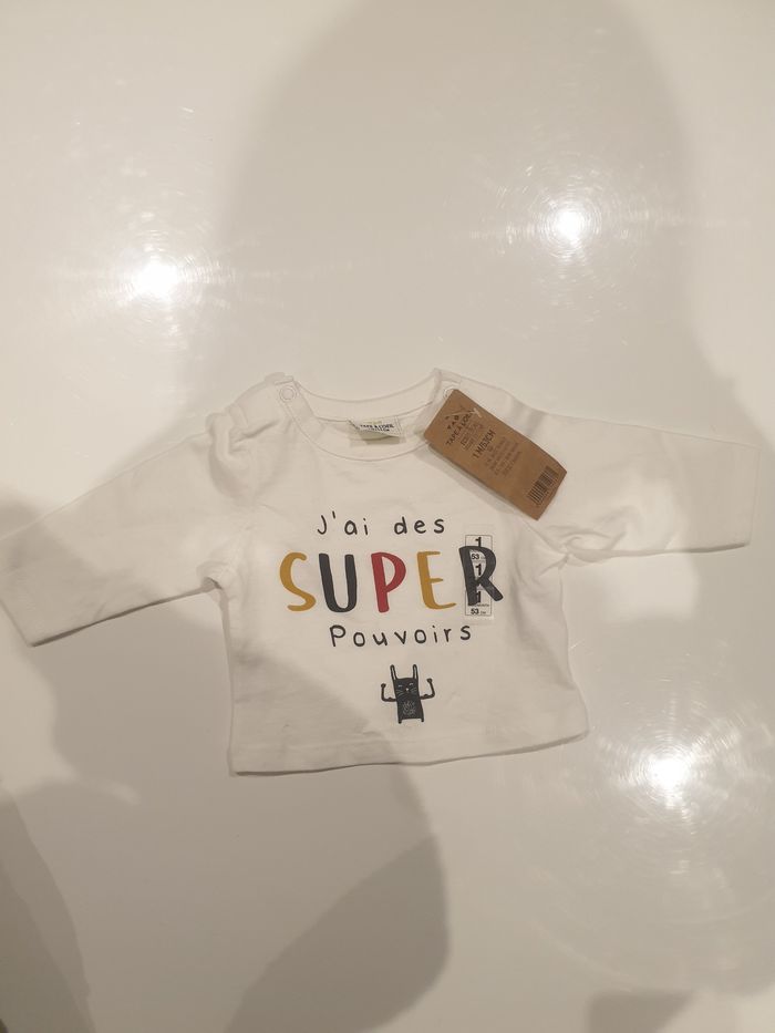 Vends T-shirt manche longue Taille 1mois Marque tape à l œil État : neuf jamais porté avec étiquette