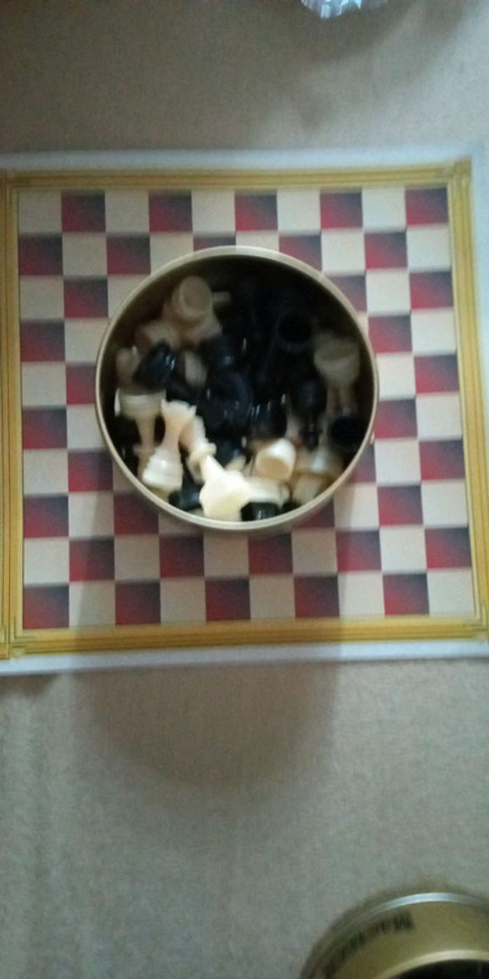Divers jeux : dames, dames anglaises, échecs, étoile à 8 branches, loup et agneau, Marelle, cheveux.... Le tout dans une pochettes rouge