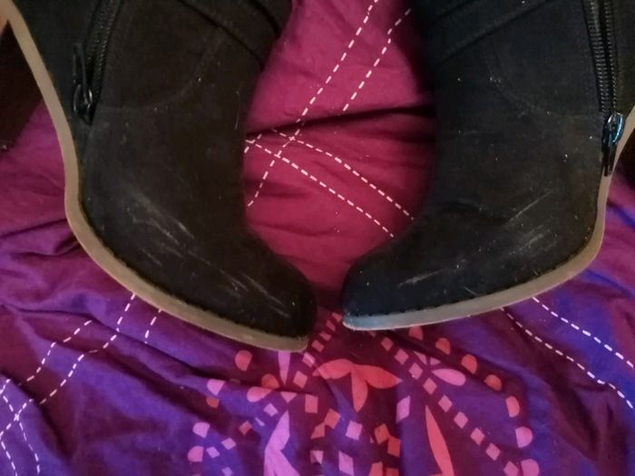 Bottines noires 37 mim. Porté quelques fois. Un peu abîmé sur les côtés (voir photo 3).