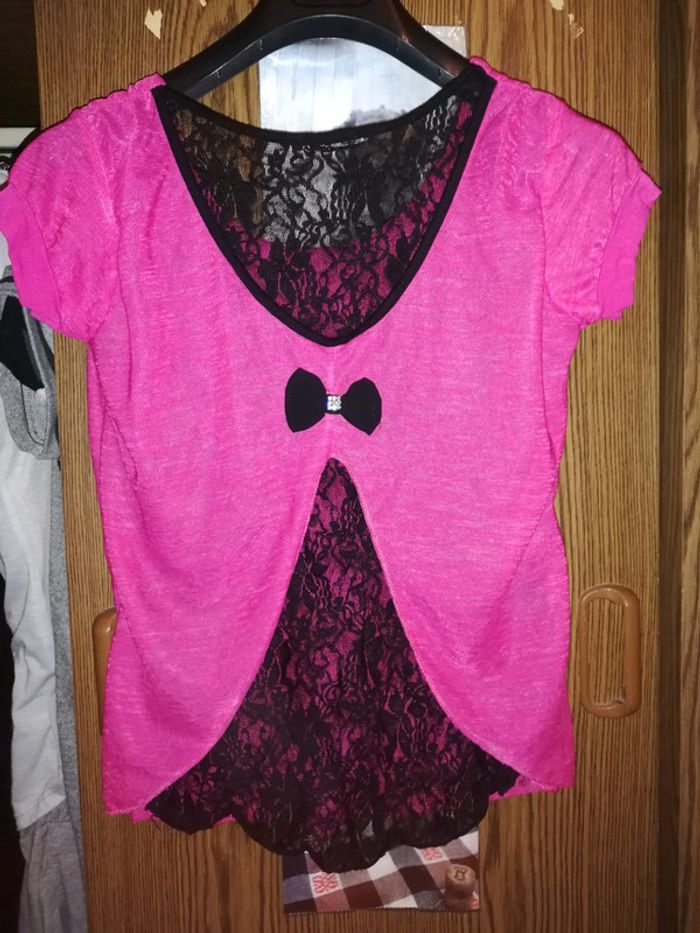 Tee-shirt rose et noir. De la dentelle dans le dos avec un petit noeud papillon. Made in Italy. Taille 38/40. Porté quelques fois en bon état.