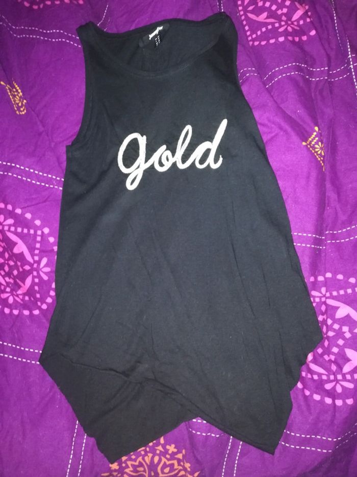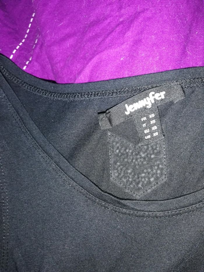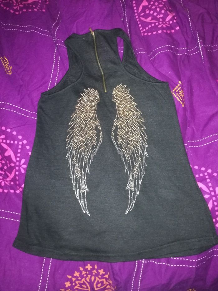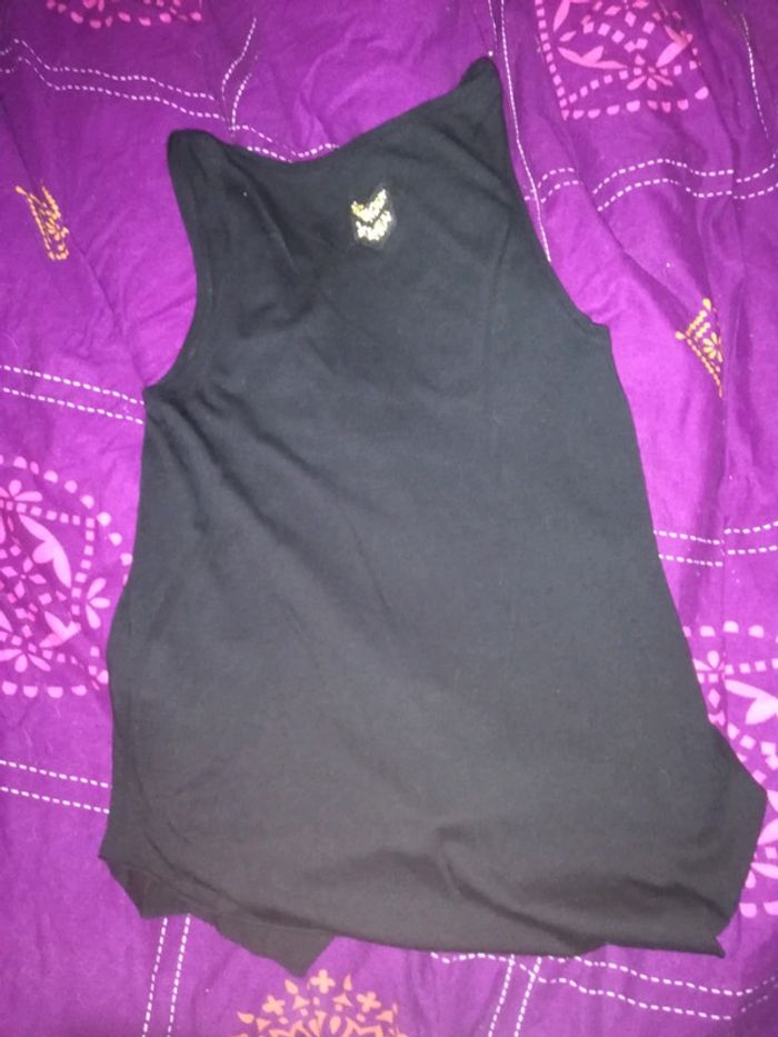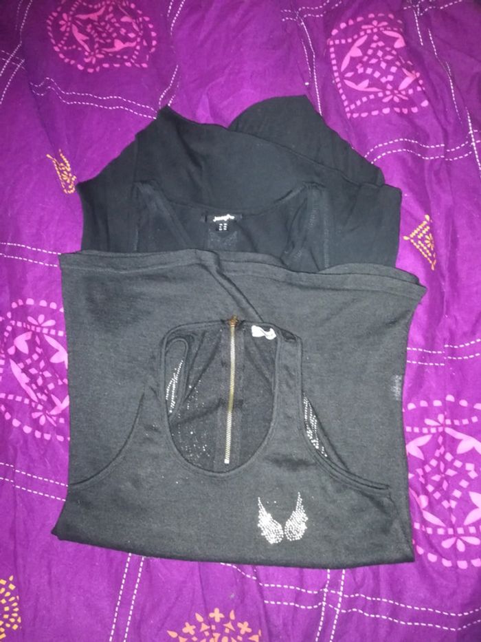Lot de deux débardeurs noirs : - débardeur noir avec des ailes dans le dos taille L marque noemie. - débardeur noir marque gold devant taille XS marque jennyfer. Il y a juste l'étiquette qui est décousu sur un côté. Porté quelques fois en bon état.