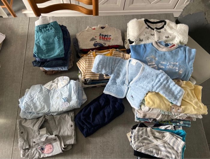 Vend un gros lot de 3 mois de toutes marque (Orchestra, tape à l’œil, Kiabi …) Ce lot ce compose de: 20 pyjamas 21 tee shirt 9 pantalons 1 salopette 1 ensemble 1 gilet 1 veste 8 bodys Pour pour de renseignements n’hésitez pas à me contacter