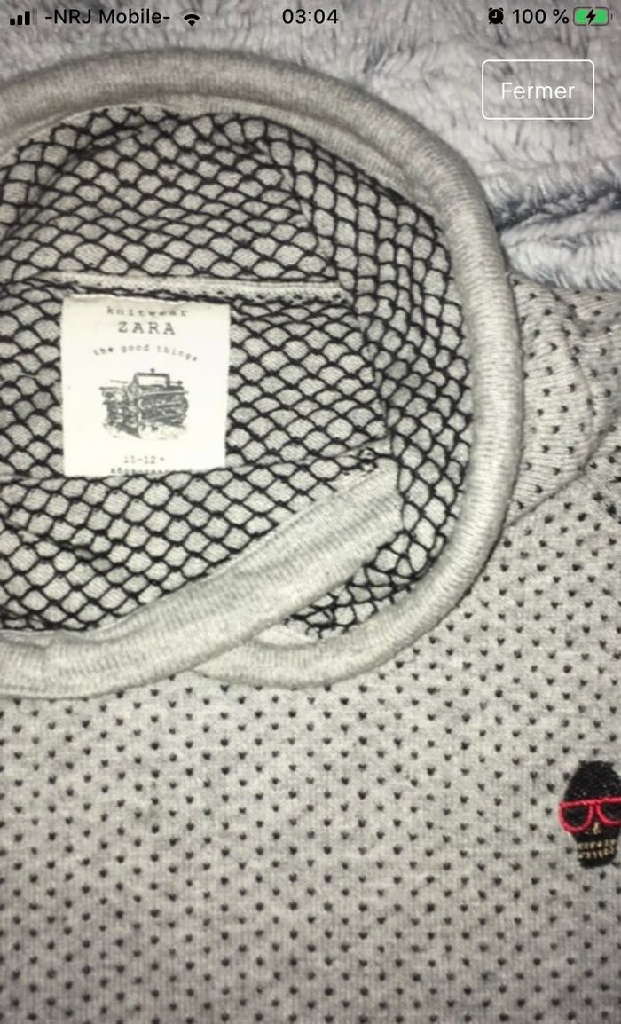 pull Zara gris motif v noir avec broderie tête de mort taille 11ans très bon état