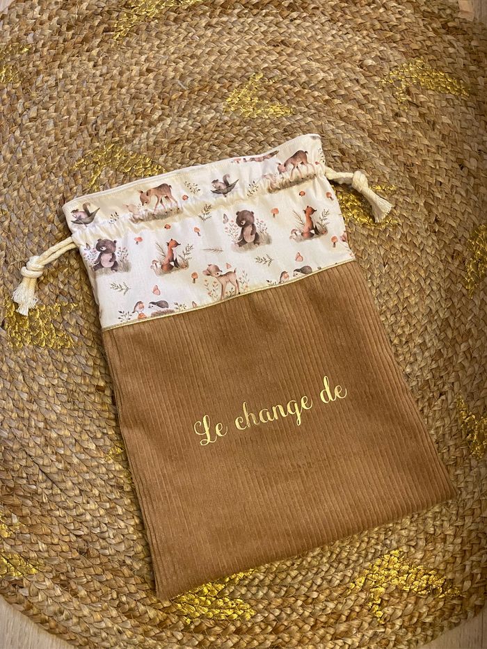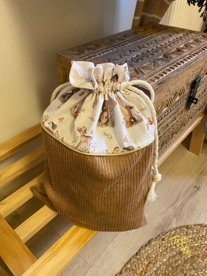 Grand sac pochon personnalisable avec le prénom En coton et velours camel