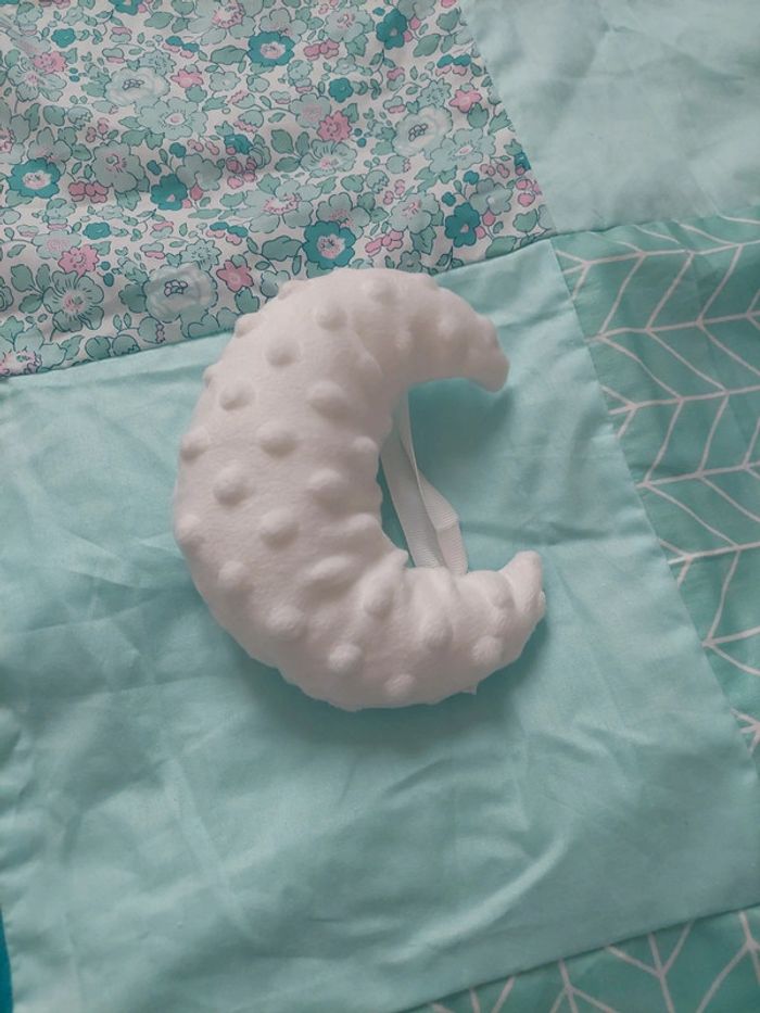 Environ 1m/1m Dans les couleurs vert Avec un anneau de dentition, des oreilles avec grelots, une lune texture, un nuage avec bruitage