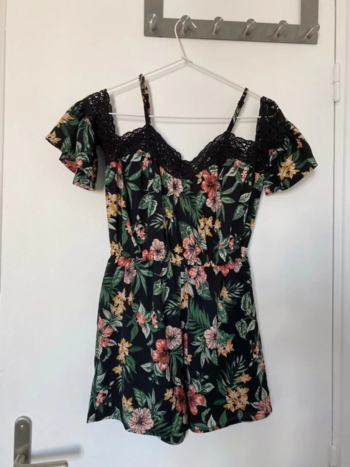 Très jolie combishort noire fleurie Épaules dénudées. Bretelles et petites manches Taille S #sev0811_92_femme #sev0811_92_femmeS