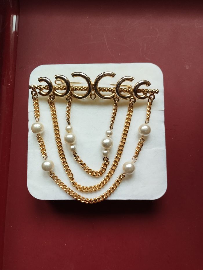 Broche fantaisie Largeur 8 cm Chainettes et perles Très bon état