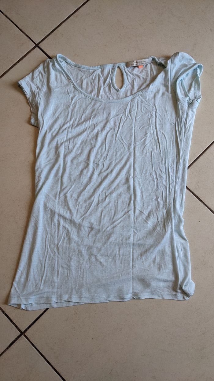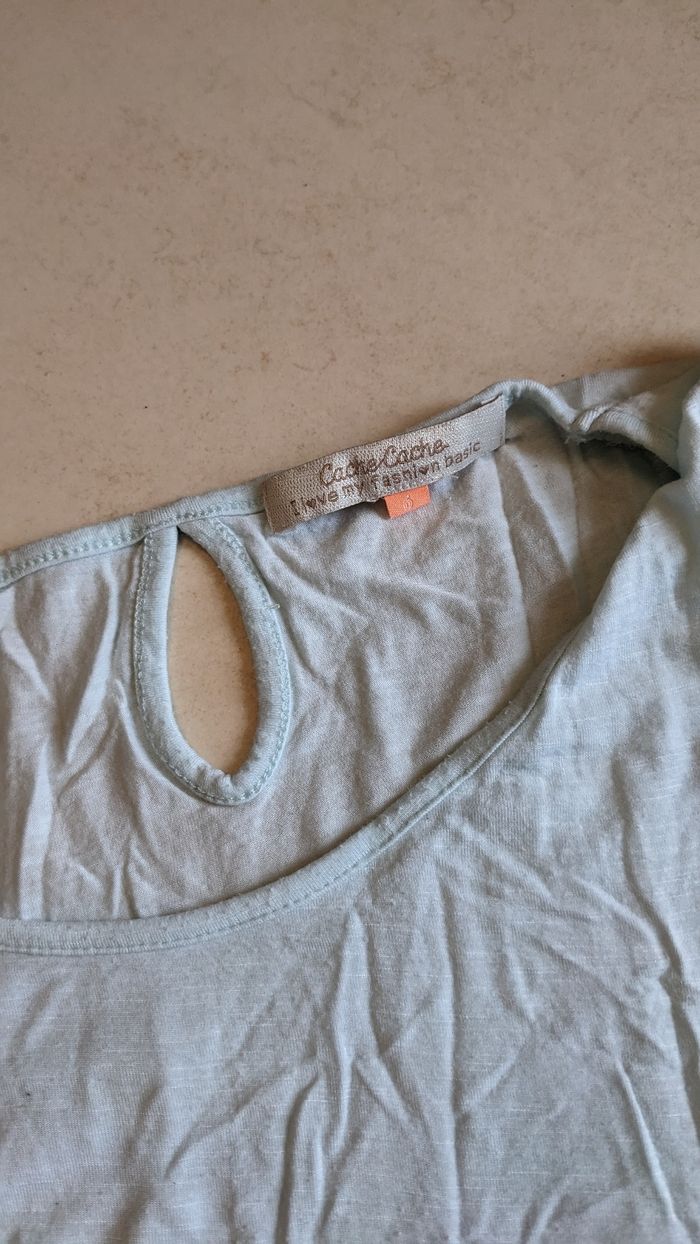 T-shirt femme bleu turquoise marque Cache cache avec goutte dans la nuque taille 6 correspondant à un 34 / XS pour fille 12 ou 14 ans en général. Mes autres annonces de même taille #joeypotter91_femmetaille34 #joeypotter91_filledouzeans #joeypotter91_fillequatorzeans