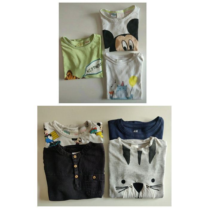Lot comprenant 7 tee shirts : Offre 3 tee shirt du haut : 2 Zara (écriture un peu effacé pour l'un et une tâche discrète près de l'oreille de Mickey pour l'autre ) 1 HetM (petite déchirure au niveau des boutons et une tâche en bas au dos du tee shirt) Photos du bas : 2 Zara (Mickey ras et tee shirt noir couleur moins éclatante mais encore en bon état ) 2 H&M en bon état (juste un petit trou sur le tee shirt bleu mais reste discret ) Peut servir de change pour l'école où pour trainer également,reste en bon état général pour une seconde vie.