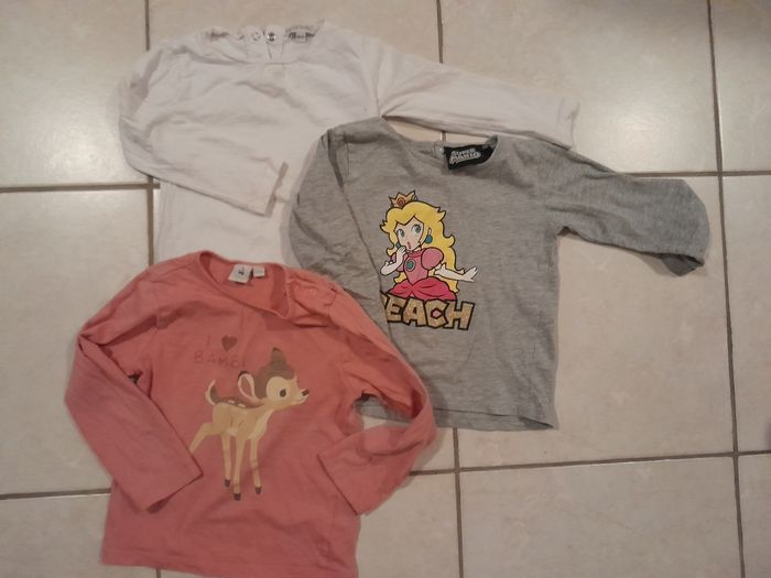 Lot de 3 tee-shirts manches longues de marque différentes. Un blanc uni et 2 avec dessins un peu abîmés. Voir photos. Possibilité de vendre séparément.