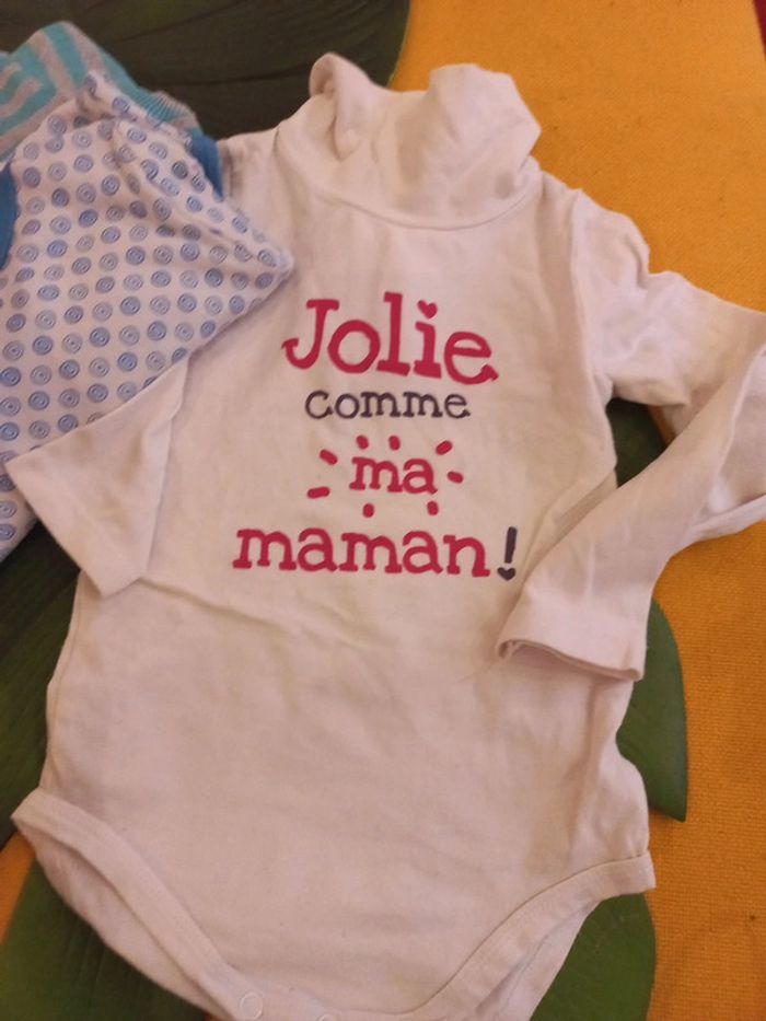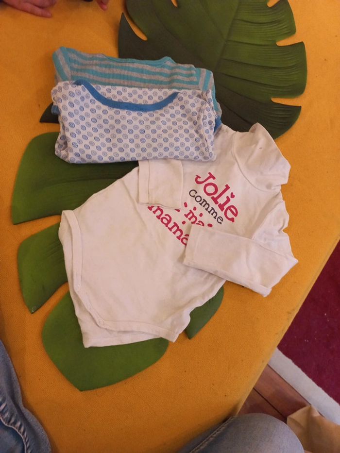 H&M 12-18 mois taille grand, plutôt un 18 a 30 mois rayé turquoise et gris Kimbaloo blanc a ronds et bords bleu Kimbaloo a col roulé blanc thème Jolie comme maman Tous en coton et très bon état,jolis et pratiques