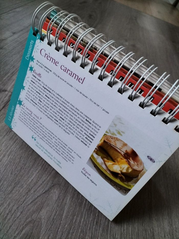 Une recette par jour . Réutilisable d'une année à l'autre car juste date de noté et pas les jours de la semaine . Idéal petit cadeau .