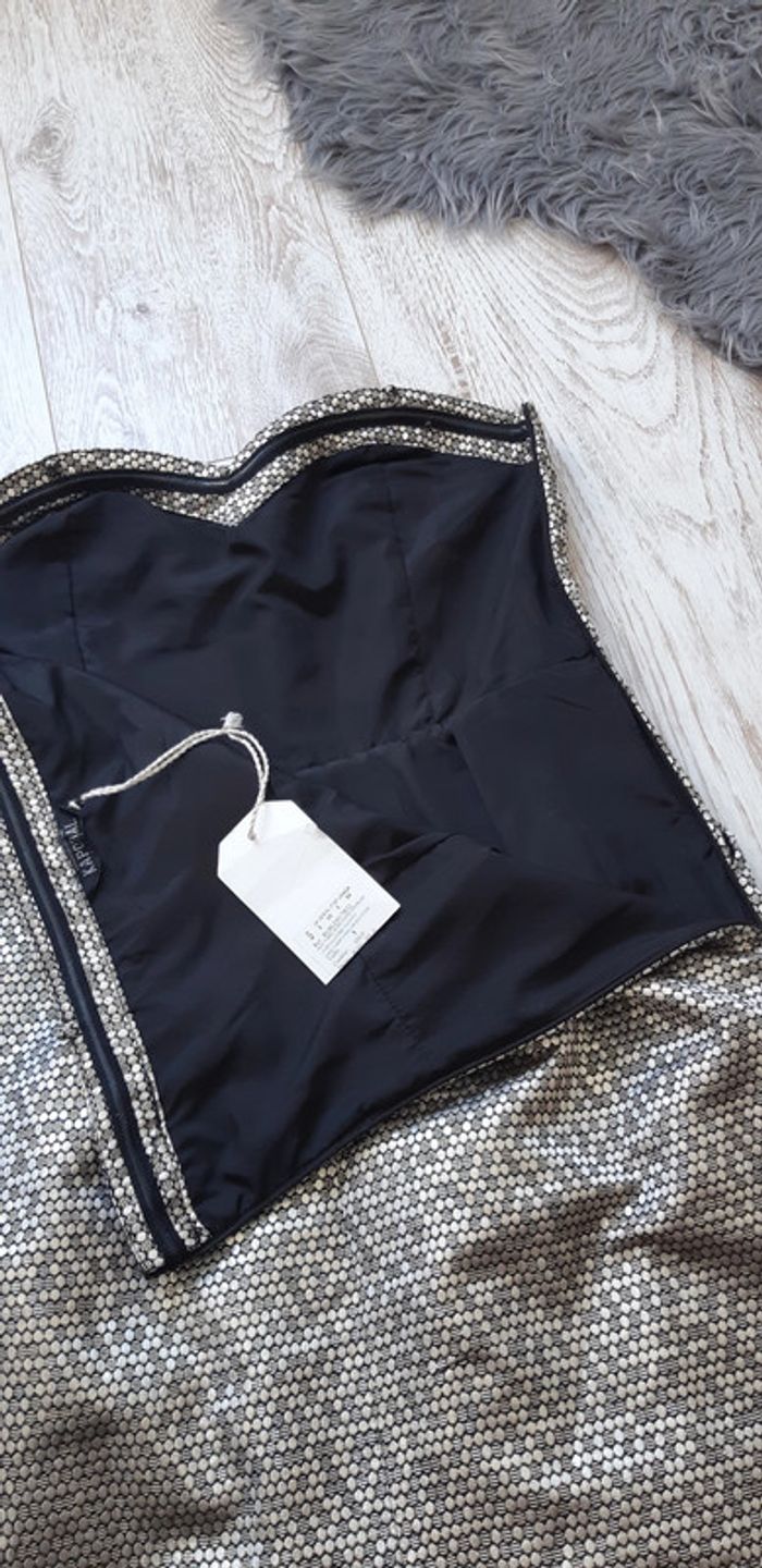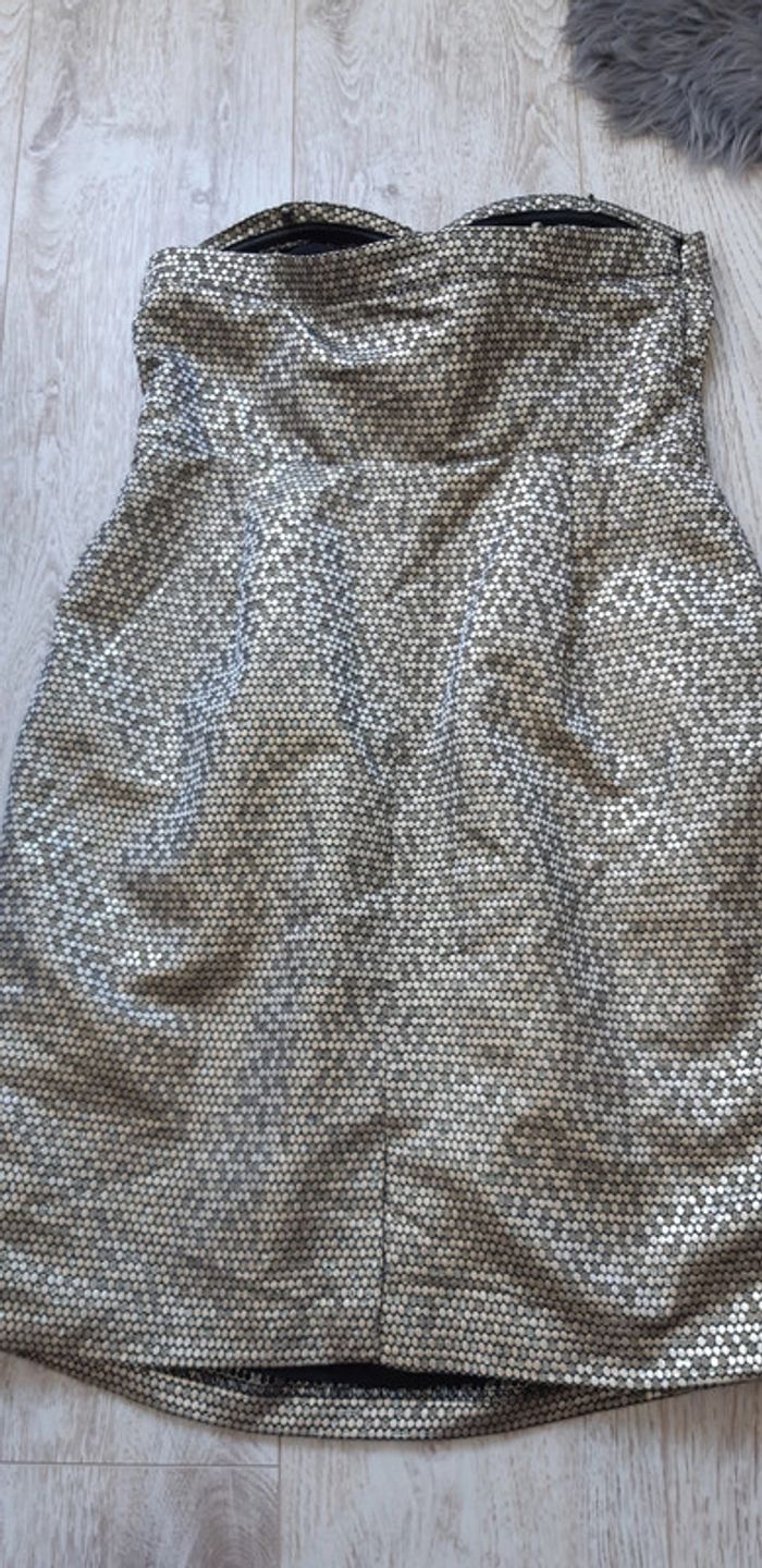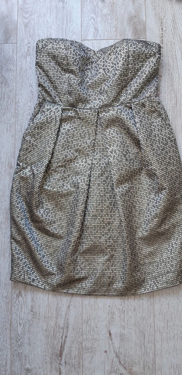 Robe bustier (possibilité de rajouter des bretelles mais ne sont pas comprises avec la robe) Neuve, étiquette toujours présente. Couleur doré et présence de fibres métalliques qui donnent un côté brillant à la robe. Doublure complète. 2 poches latérales. ⚠️convient pour les petites poitrines⚠️ N'hésitez pas pour plus d'informations..