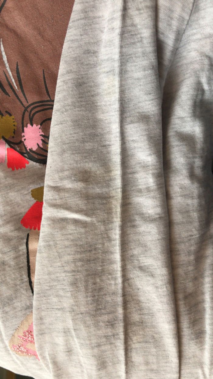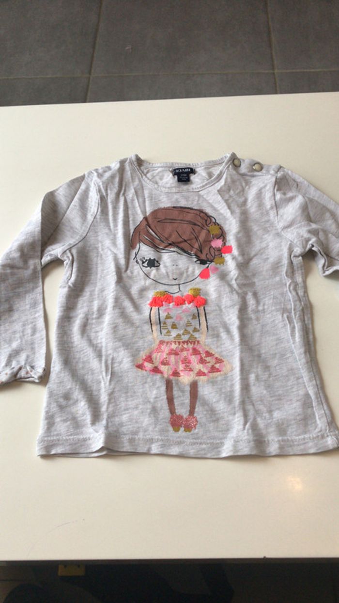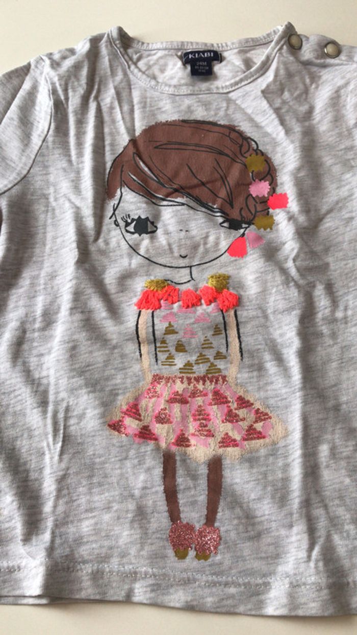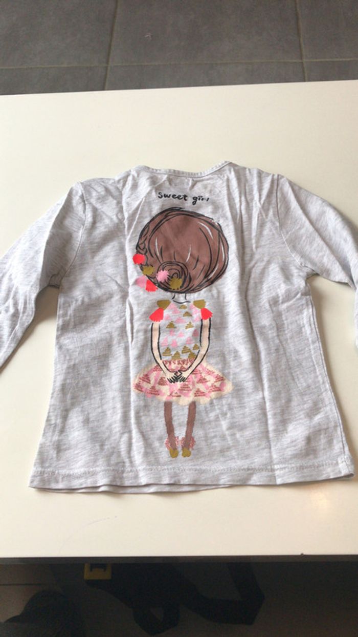 T-shirt manches longues gris, avec petite fille recto-verso, marque Kiabi, taille 24 mois, en bon état, taches comme sur photo