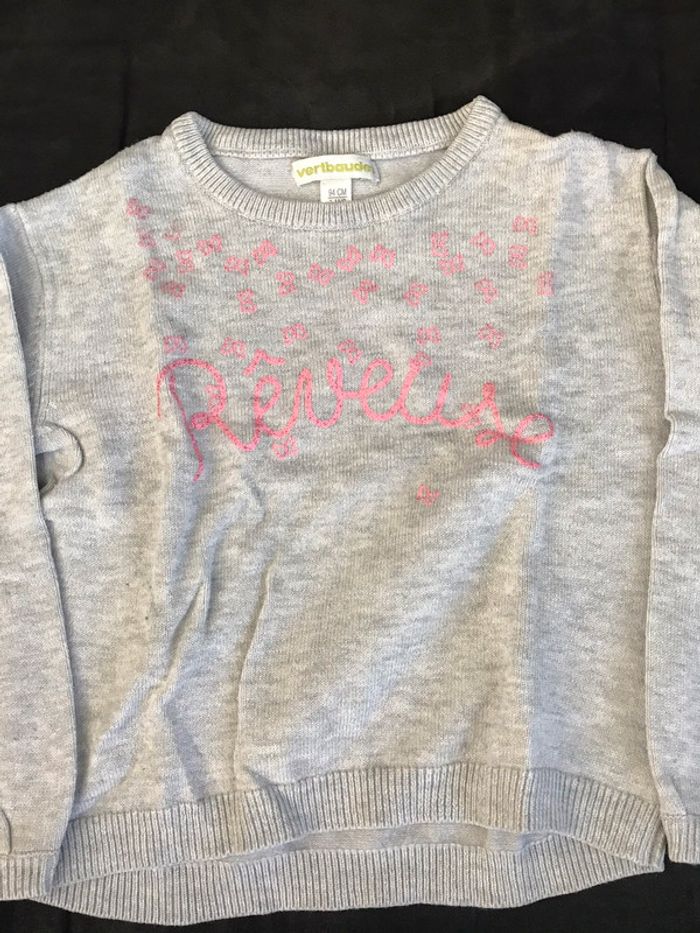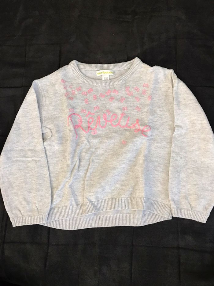 pull gris avec inscription rose pailletté, marque vertbaudet, taille 3 ans, bon état, aucunes taches