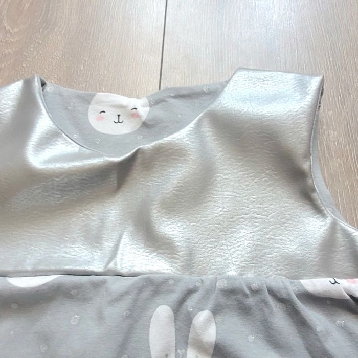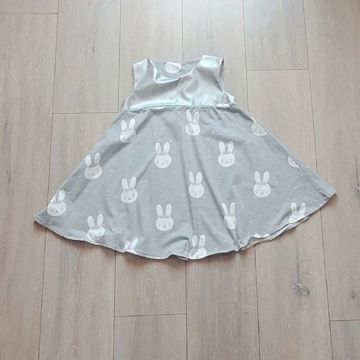 Très très jolie robe grise fait avec un tissu de qualité, motif lapin avec couronne argentée brillante avec parfois un strass sur la couronne et points gris brillant. Haut doublé en tissus et matière simili cuir gris souple. Robe réalisée par une couturière. Fille 5/6ans (61 cms du haut de l'épaule au bas de la robe) En excellent état Il y a plein d autres articles dans cette taille dans mon dressing  🤗 #lunaclara60fille5ans #lunaclara60fille6ans