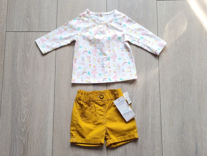 Très bel ensemble moutarde et blanc à motif. Fille 3 mois. Marque Orchestra/Kiabi