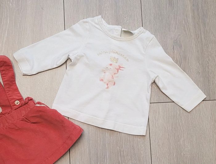 Ensemble 2 pièces : - maillot avec petit lapin écrit " Mini princesse " blanc - jupe salopette , orange/rouge Fille 3 mois. Marque Tape à l'oeil Excellent état Il y a plein d autres articles dans cette taille dans mon dressing  🤗 #lunaclara60fille3mois