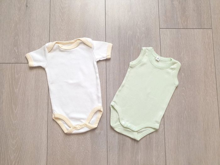 Lot de 2 body : - 1 blanc et jaune, manches courtes . Marque Trois kilos 7 - 1 vert façon debardeur Garçon 3 mois. Très bon état Il y a plein d autres articles dans cette taille dans mon dressing  🤗 #lunaclara60garcon3mois #lunaclara60fille3mois