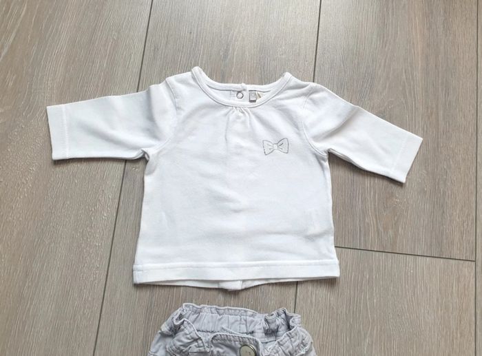 Ensemble 2 pieces : - maillot blanc avec noeud argenté. Marque Orchestra - pantalon gris. Marque Tape à l'oeil Fille naissance Très bon état Il y a plein d autres articles dans cette taille dans mon dressing  🤗 #lunaclara60fillenaissance