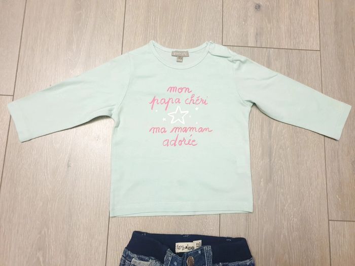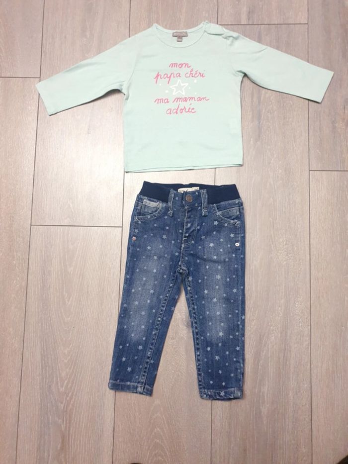 Ensemble 2 pièces : - maillot bleu . Marque Grain de blé - jeans slim bleu avec etoile. Taille élastique. Marque Kimbaloo Fille 12 mois. Tres bon état Il y a plein d autres articles dans cette taille dans mon dressing  🤗 #lunaclara60fille12mois