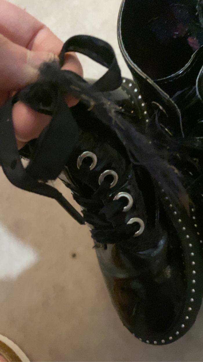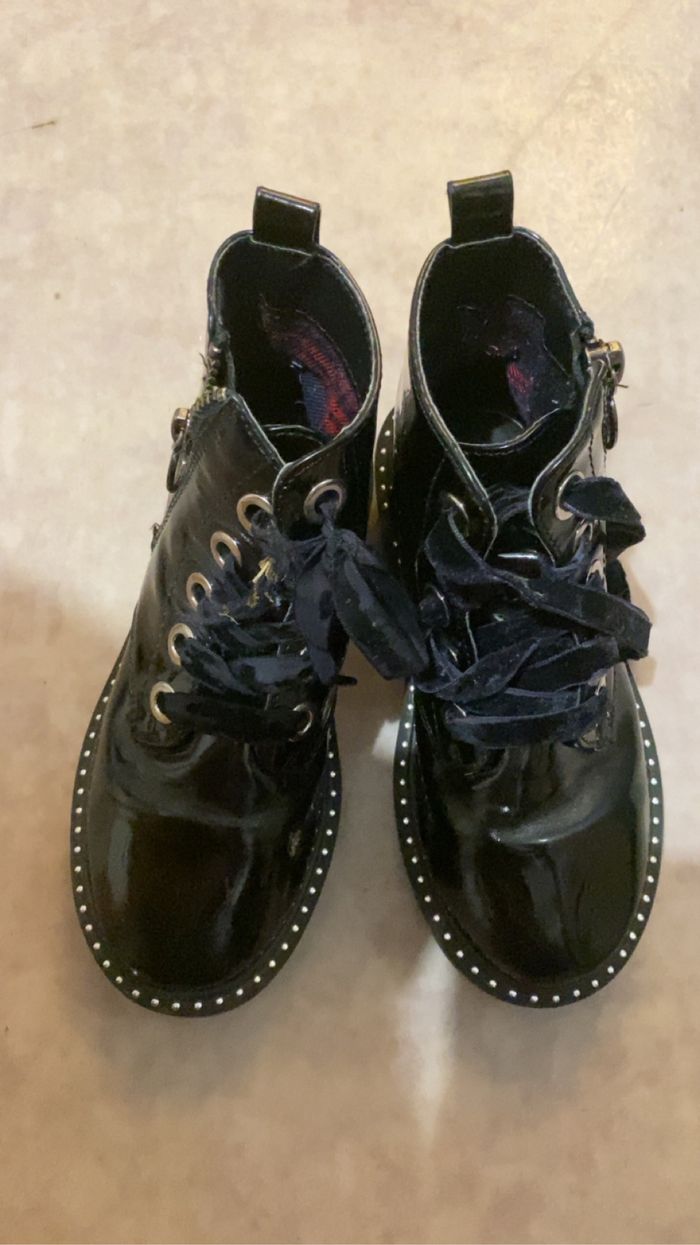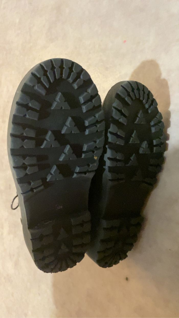Vends boots / bottine pointure 28 en trés bonne état peu porté mise a part un lacet qui s’éffiloche (voir photo matiére du lacet genre tissus)vous pouvez remplacer par d’autre lacets 10€