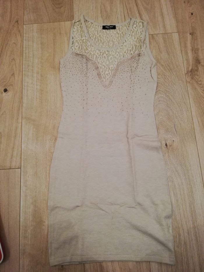 Porté une fois, en très bon état, moulant, dentelle au décolté, quelques paillettes, taille unique