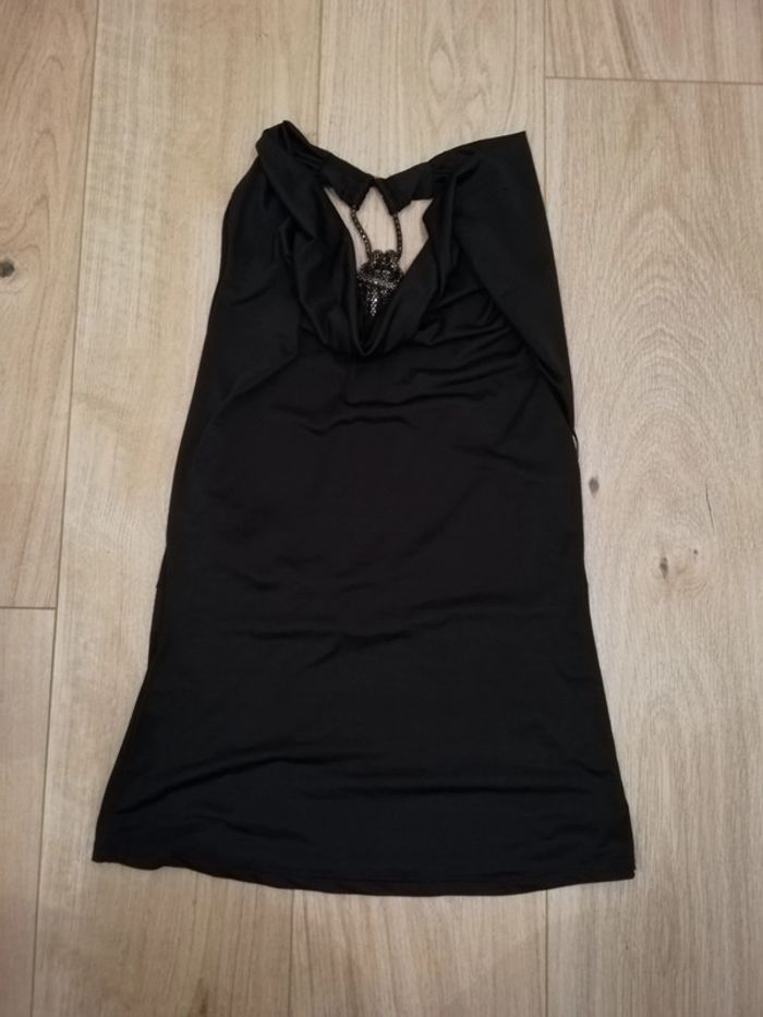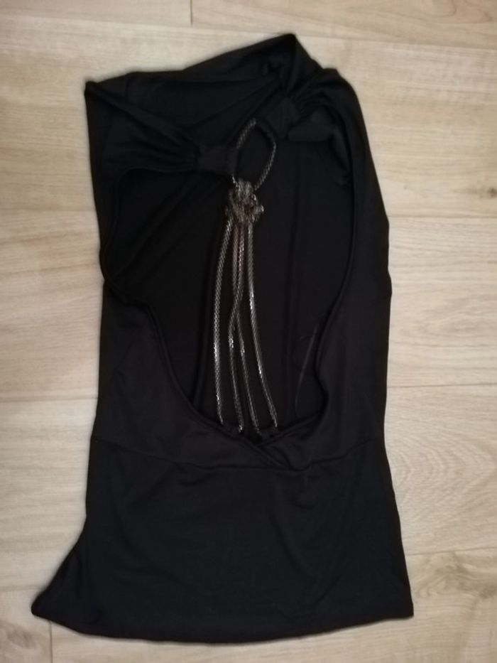 Jamais porté, en très bon état, dos nu avec cordelettes métalliques, devant avec col tombant, matière moulante